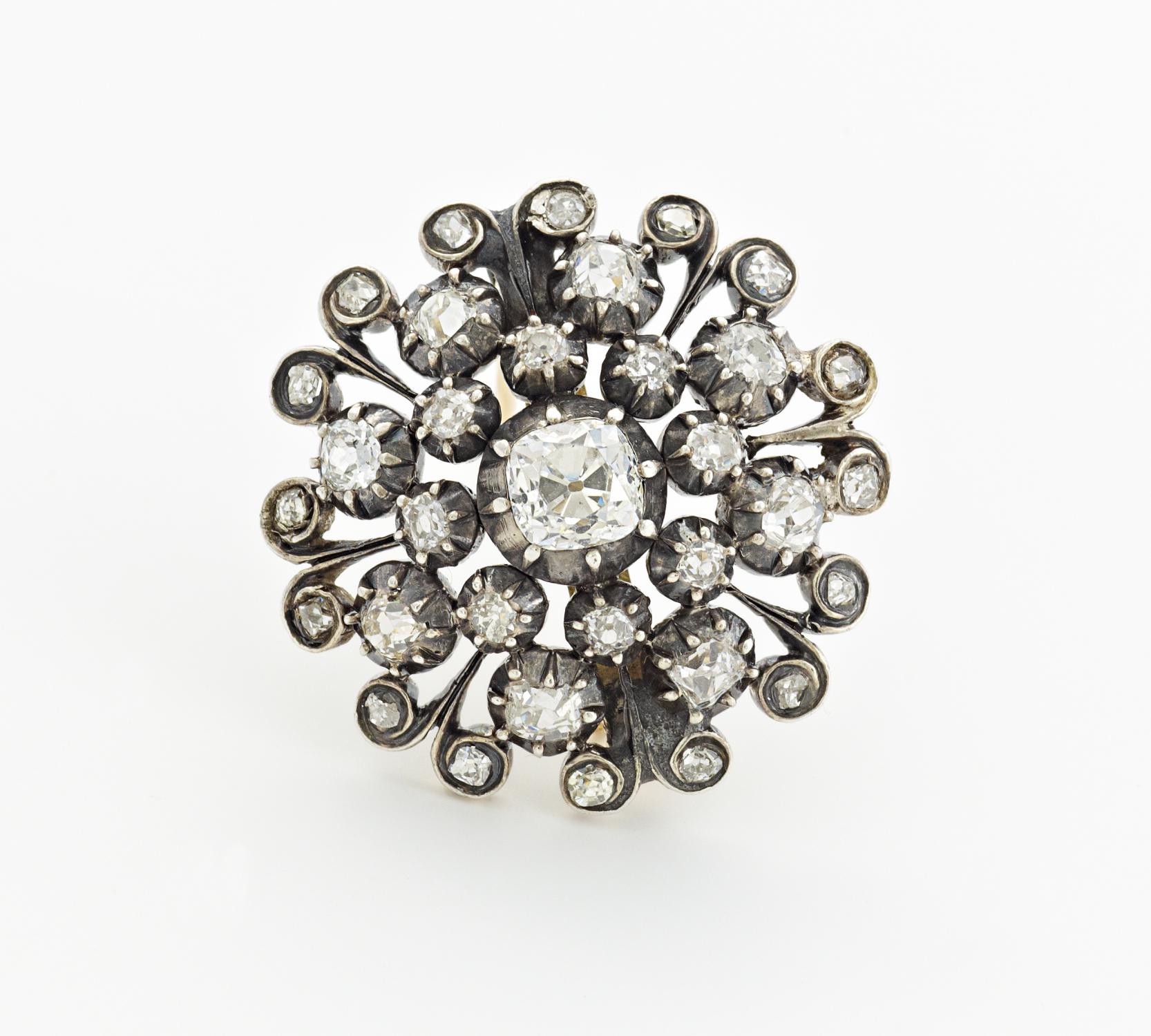 585/- Gelb-/Roségold, Silberverbödung, Gewicht: 6,2g. 18 Altschliff-Diamanten zus.ca. 0,903ct TCr-Cr(I-J) VS-SI, 16 winzige Diamantrosen, D. 2,5cm. Broschierung neueren Datums.