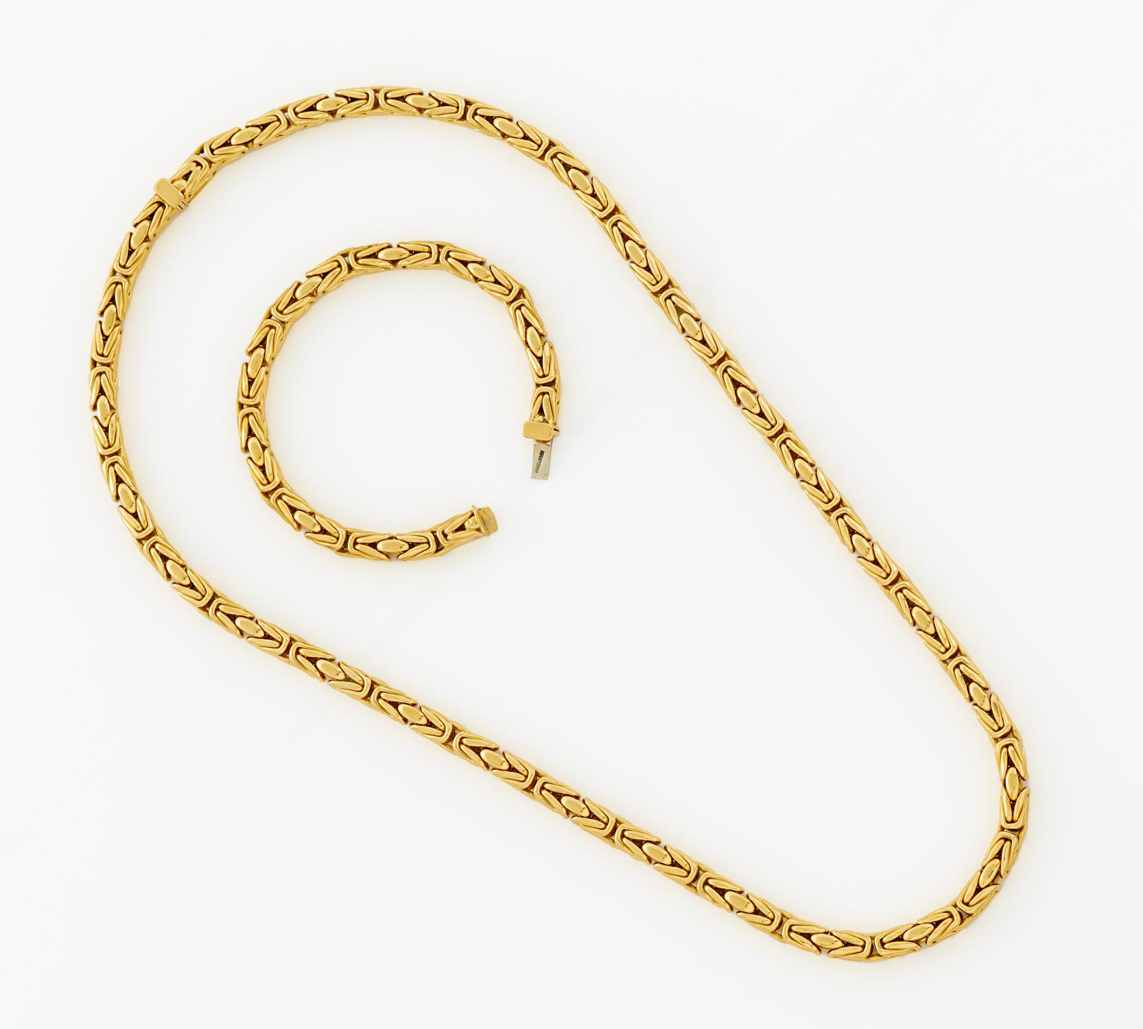 750/- Gelbgold, Gewicht: 133,2g. Collier: L x B=61,0 x 0,5cm, Armband: L x B=19,5 x 0,5cm. Im Königskettenmuster.