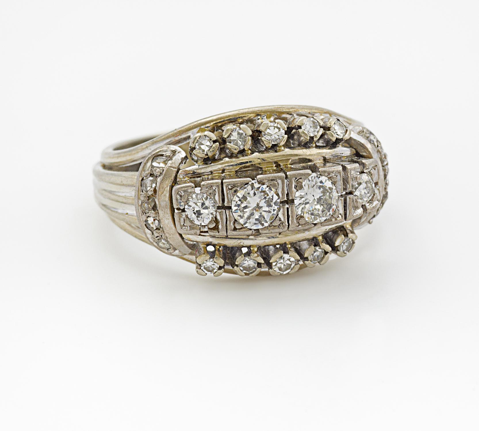 585/- Weißgold, Gewicht: 5,4g. 4 Brillanten zus.ca. 0,393ct W(H) VS, 10 winzige 8/8-Diamanten, 10 winzige Diamantrosen, EU-RM: 55.