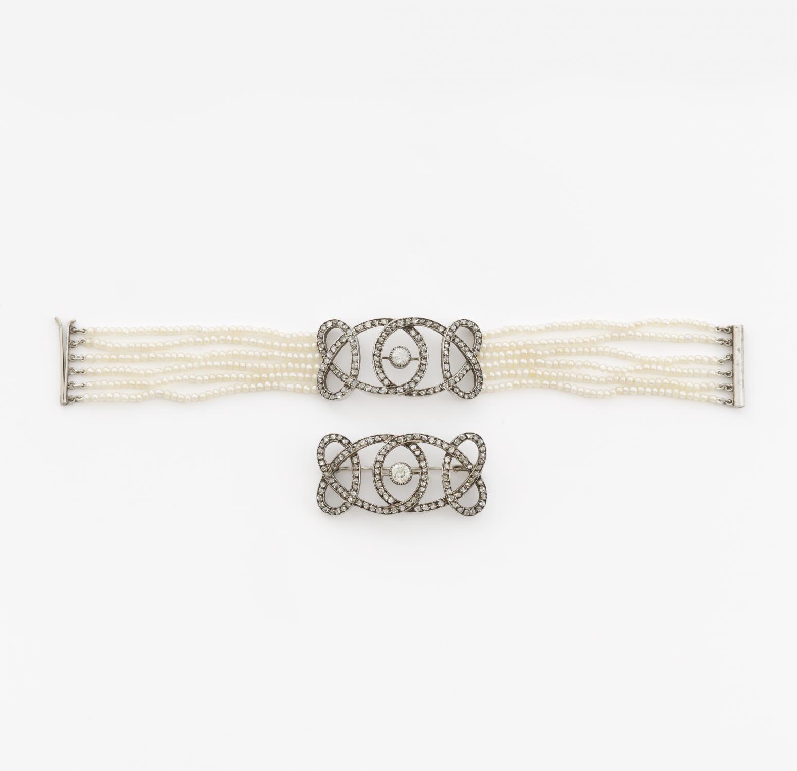 Historismus. Armband und Brosche mit Naturperl-Diamantbesatz.