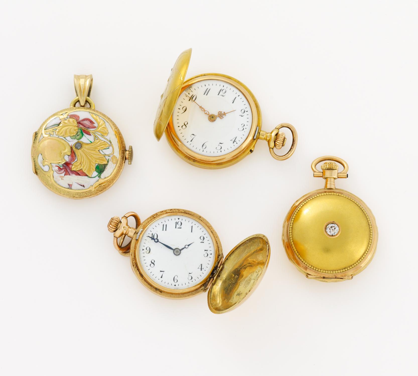 Gehäuse: 585/- Gelbgold, Zffbl. bedruckt, lackiert, Handaufzug. Teilweise emailliert und diamantgeziert. D. 2,8-2,5cm. Gewicht: 65,2g. [A] D [G] 14 [Z] 4 [W] 4,27