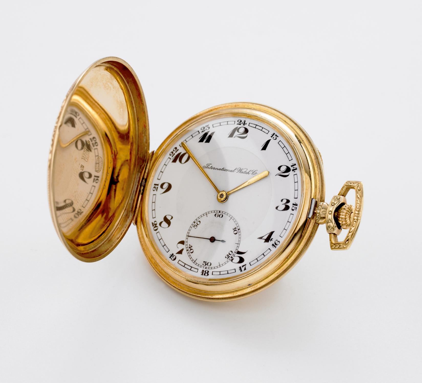 Herrentaschenuhr-Savonette. Gehäuse-Nr.: 954153. Werk-Nr.: 852071. Gehäuse: 585/- Gelbgold, Cal.53T, elegante Herrentaschenuhr der Marke "IWC". Sehr schönes dekoriertes Savonette-Gehäuse in