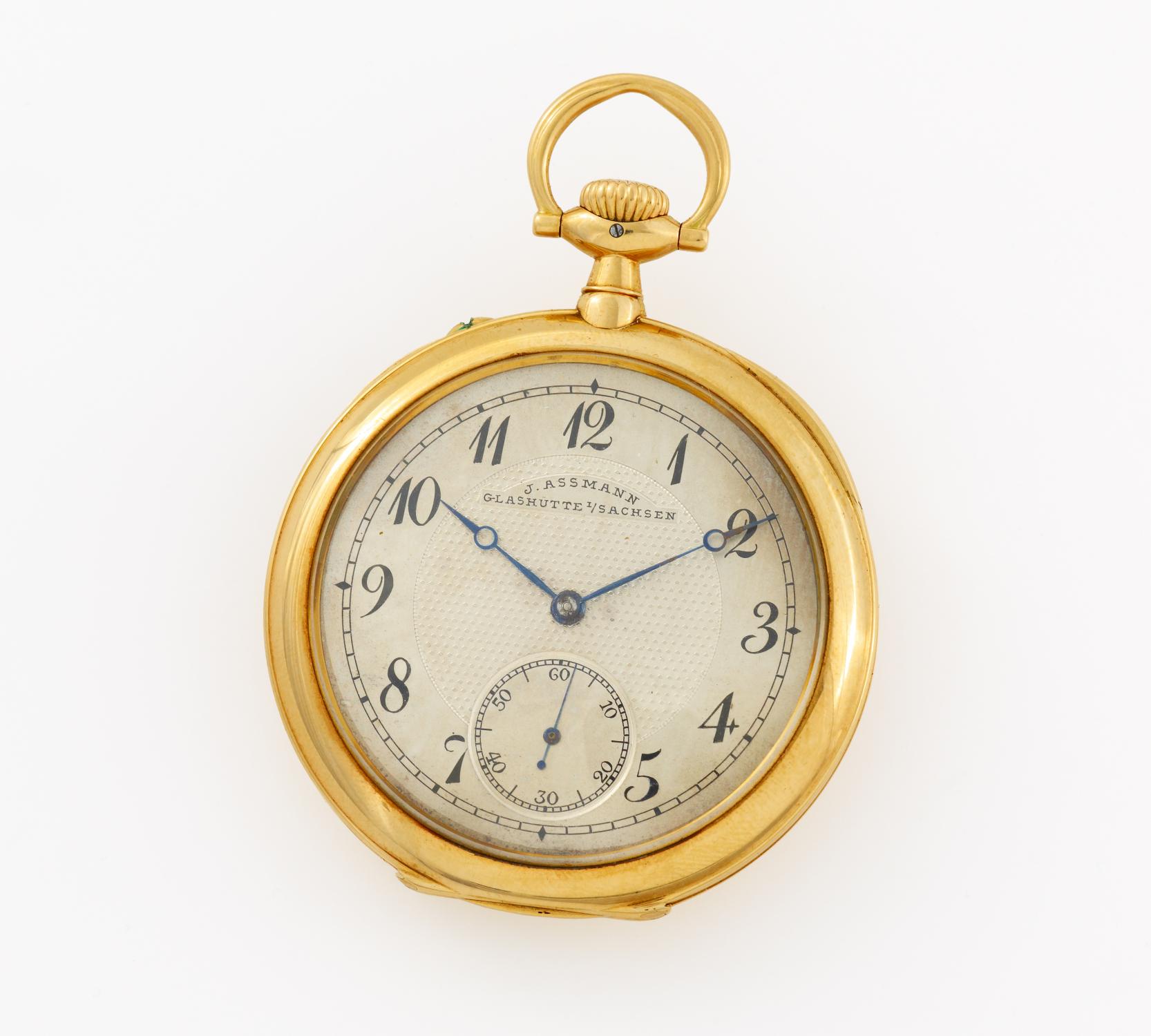 Lepine. Gehäuse-Nr.: 21565. Werk-Nr.: 21565. Gehäuse: 585/- Gelbgold, Zffbl. silbern, bedruckt, Handaufzug. Präzionswerk mit geteilter 3/4-Platine und Schwanenhalsfeinregulage. D. 5,2cm. Gewicht: 104,2g.