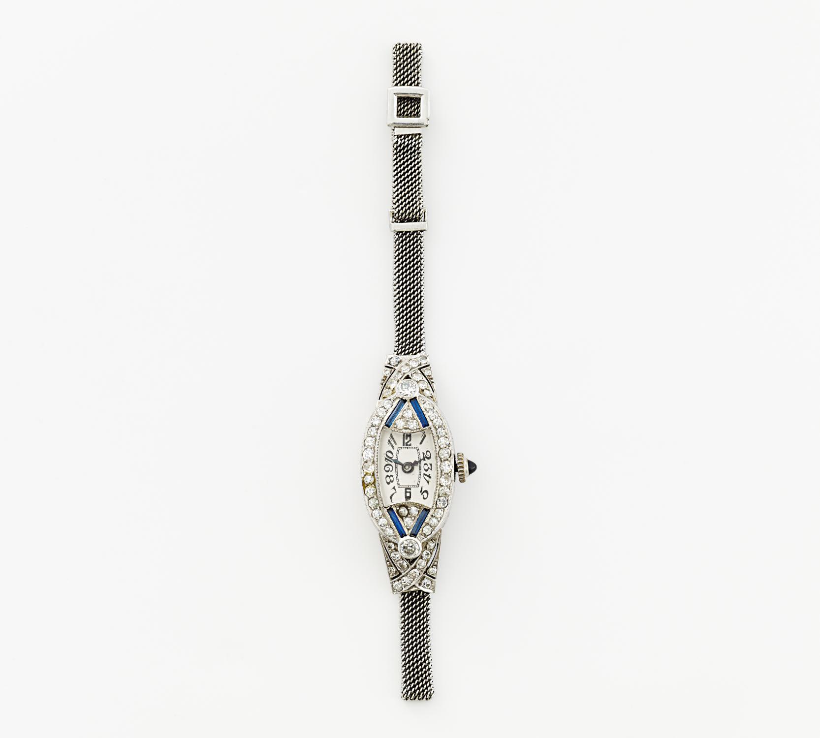 Cocktailarmbanduhr. Gehäuse: 950/- Platin, 585/- Weißgold, Zffbl. weiß, schwarze Ziffern/Zeiger, Saphircabochon, Handaufzug. Lünette und Bandanstöße diamantverziert, 4 synthetische Saphir-Baguettes. L. 16,5- 26,0cm, D. 2,5 x 1,5cm. Gewicht: 17,3g.