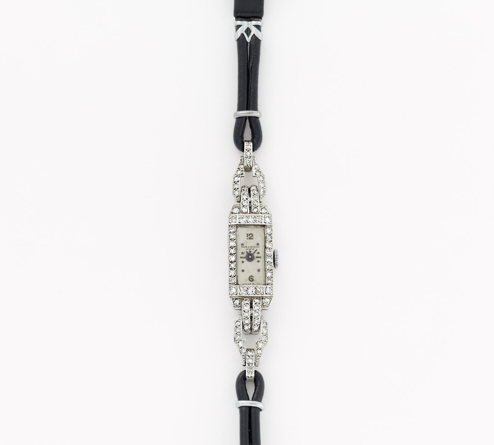 Art Deco. Cocktailarmbanduhr. Gehäuse-Nr.: 2035. Gehäuse: 900/- Platin, Lederarmband schwarz, Faltschließe Stahl, Zffbl. weiß, schwarze Ziffern/Zeiger, diamantgeziert, Handaufzug. L. 20,5cm, D. 1,7 x 1,0cm. Gewicht: 15,0g.