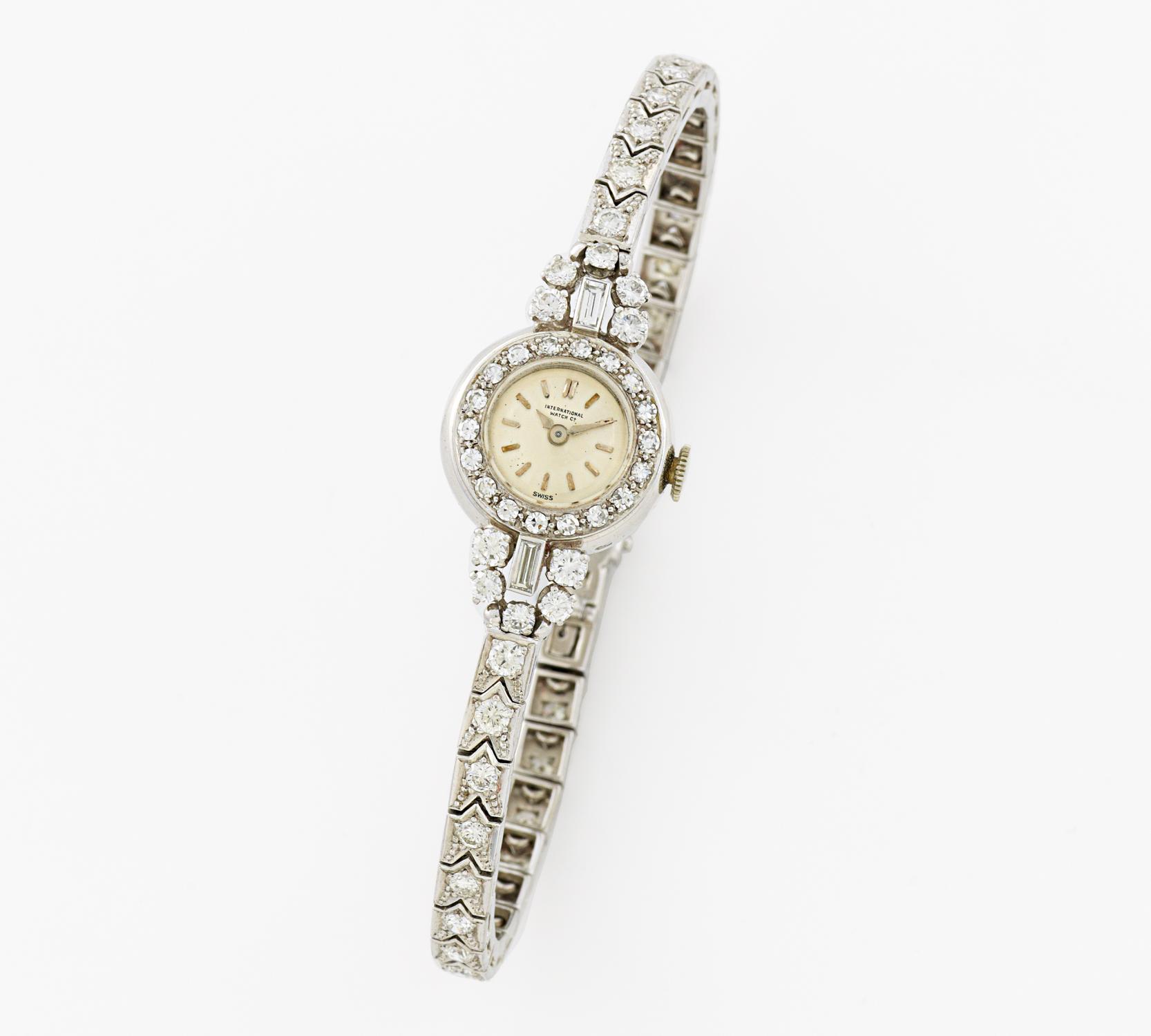 Cocktailarmbanduhr. Gehäuse: 750/- Weißgold, Zffbl. crème, silberne Indizes/Zeiger, Handaufzug (defekt). Armband, Lünette sowie Bandanstöße diamantbesetzt. L. 17,3cm, D. 1,6cm. Gewicht: 23,3g.