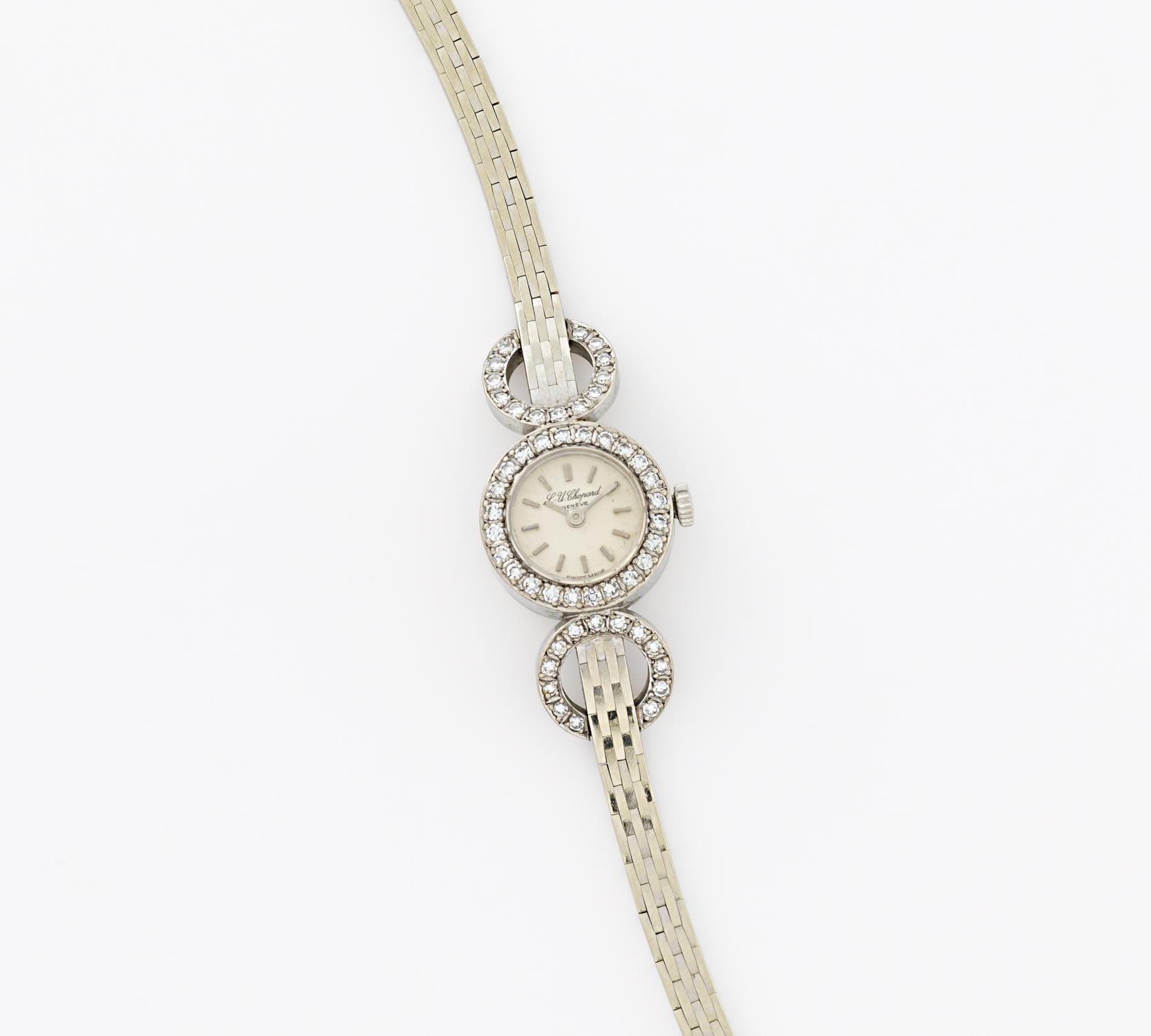 Damenarmbanduhr. Gehäuse: 750/- Weißgold, Zffbl. weiß, silberne Indizes/Zeiger, Handaufzug. Lünette und Bandanstöße diamantbesetzt. L. 18,5cm, D. 1,5cm. Gewicht: 26,3g.