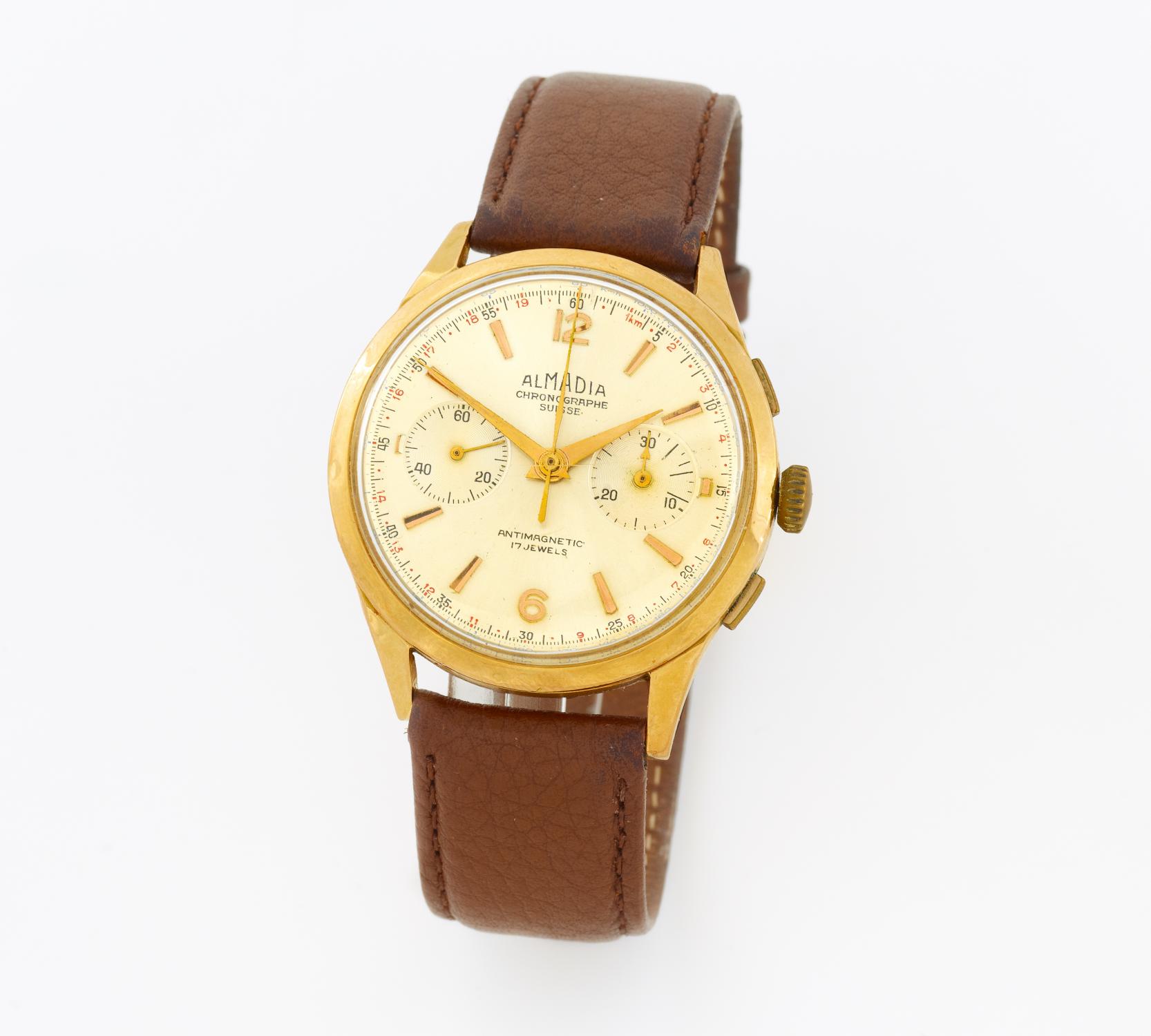 Chronograph. Herrenarmbanduhr. Gehäuse: 750/- Gelbgold, Lederarmband braun, Dornschließe (Plaque), Zffbl. silbern-crème, dez. Sekunde, Handaufzug. L. 23,5cm, D. 3,8cm. Gewicht: 48,2g.