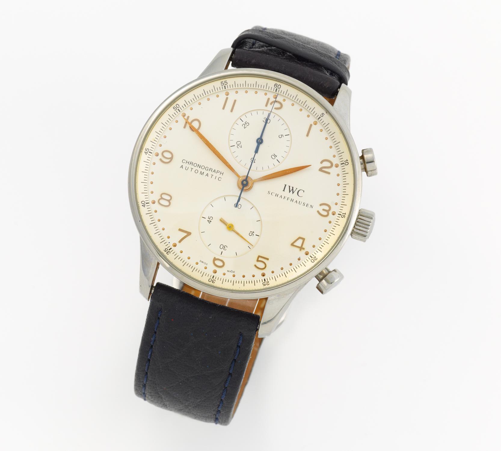 Portugieser. Herrenarmbanduhr. Gehäuse-Nr.: 2816333. Gehäuse: Edelstahl, Lederarmband schwarz, Orig.-Dornschließe, Zffbl. crème, dez. Sekunde, Automatik. IW3714-01. Anbei Orig.-Lederetui und IWC-Garantiekarte von Juni 2002. IWC-Kartonage