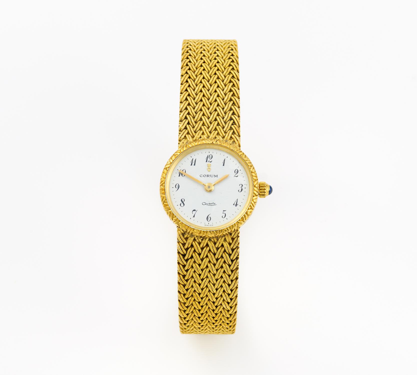 Damenarmbanduhr. Gehäuse-Nr.: 329078. Referenz-Nr.: 31272P50. Gehäuse: 750/- Gelbgold, Zffbl. weiß, schwarze Ziffern, goldene Zeiger, Saphircabochon, Quartz. L. 19,0cm, D. 2,2cm. Gewicht: 52,8g.