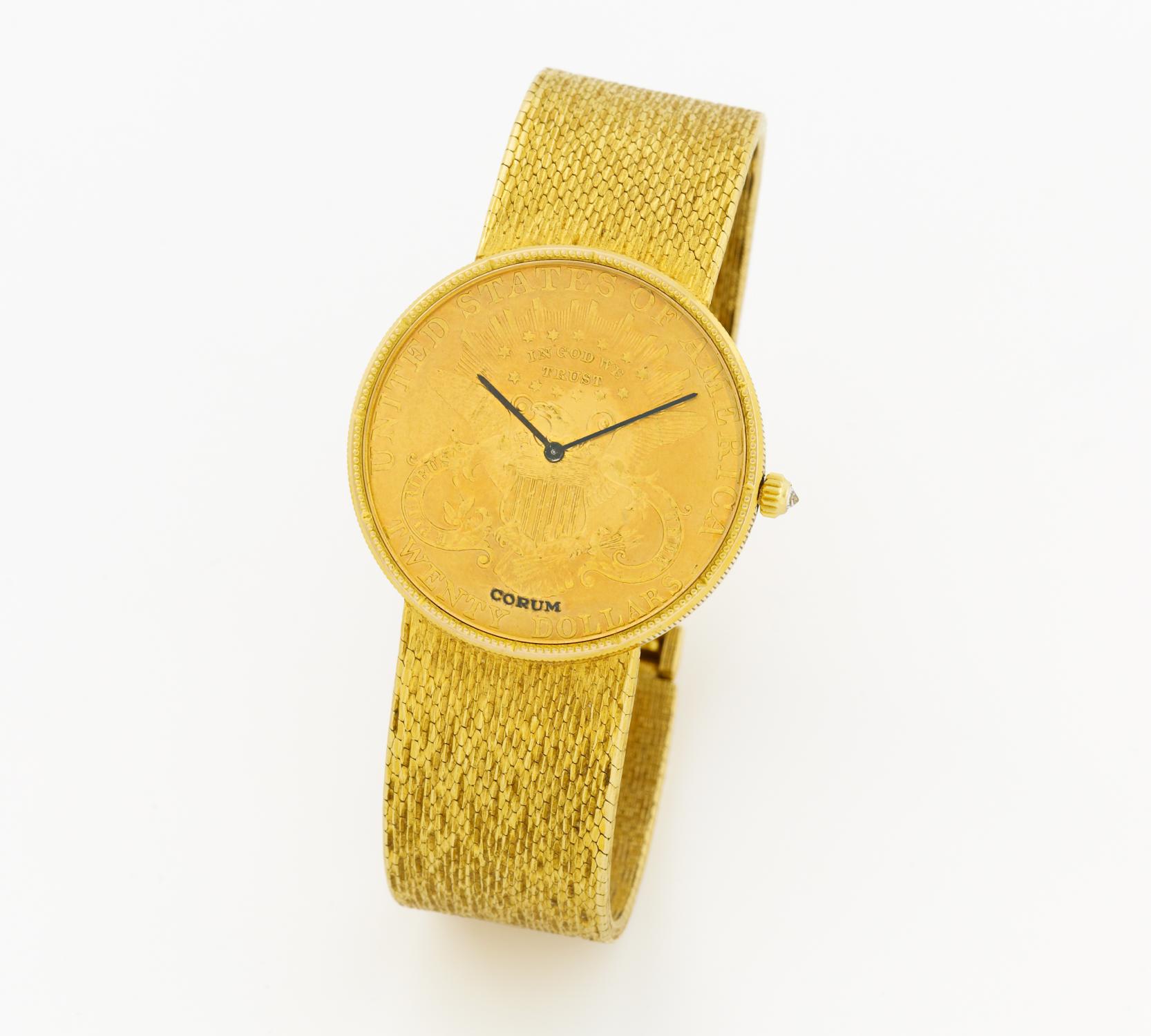 Herrenarmbanduhr. Gehäuse: 750/- Gelbgold, Zffbl. 20 Dollar-Münze, schwarze Zeiger, Handaufzug. 20-Dollar Münze aus 900/- Gelbgold, rückseitig datiert 1904, Milanaise-Band, mattierte
