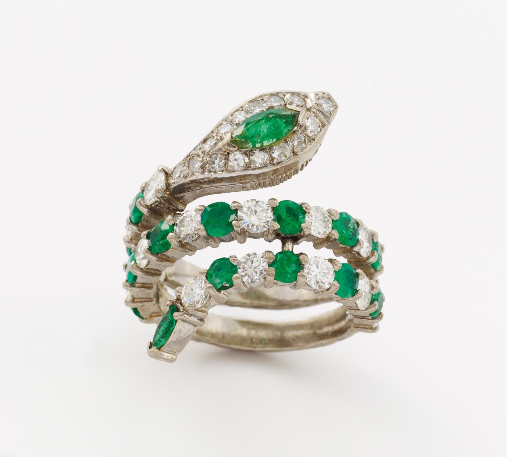 900/- Platin, Gewicht: 10,2g. 13 rund facettierte Smaragde, 2 Smaragd-Navettes zus.ca. 0,675ct, 15 Brillanten, 15 8/8-Diamanten zus.ca. 1,725ct W-TCr(H-I) VS, EU-RM: 52. Das Symbol der Schlange fasziniert seit Jahrhunderten die Menschheit. Siehe auch: Falk,