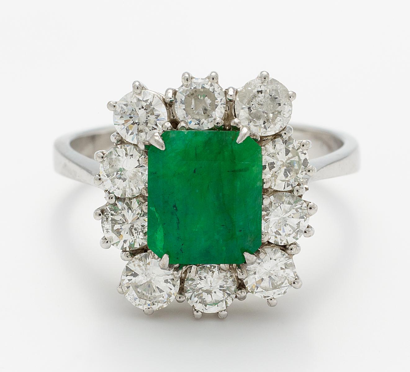 Weißgold. 5,2g. 1 facettierter Smaragd im Tafelschliff, 10 Brillanten, EU-RM: 56.