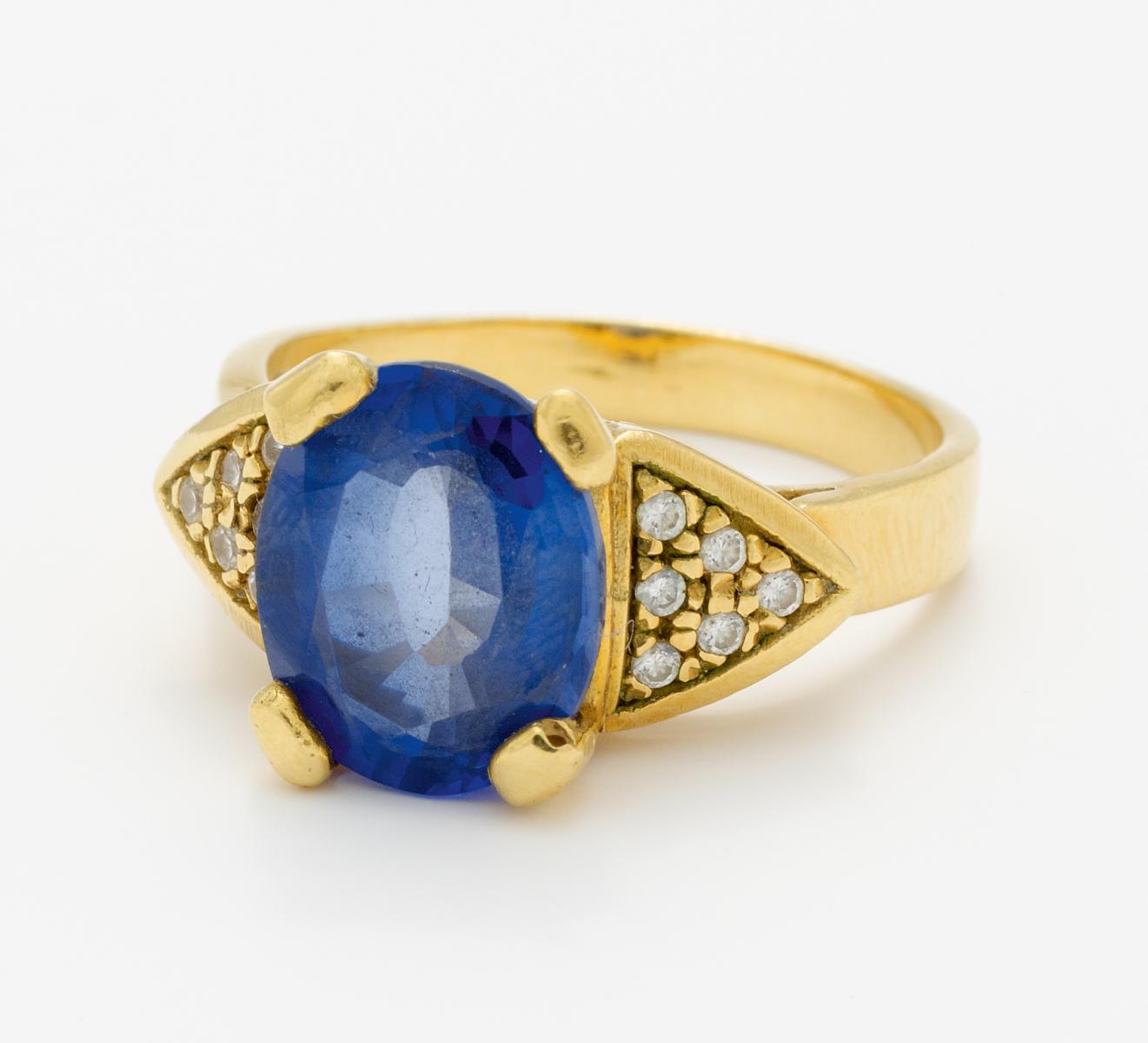 750/- Gelbgold, gestempelt. 7,2g. 1 oval facettierter Saphir, 12 winzige Brillanten, EU-RM: 57,5.
