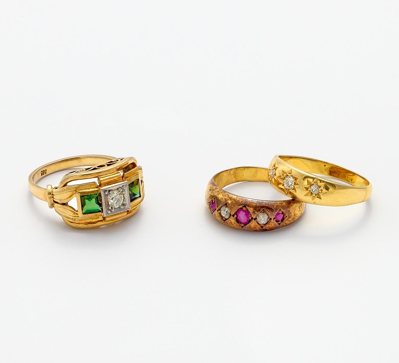 585/-, 750/- Gelbgold, gestempelt; Goldfarben. 3,1g; 4,7g; 2,8g. 3 winzige, rund facettierte Rubine, 2 Turmalin-Karrees, 6 Diamanten im Alt- und Rosenschliff, EU-RM: 54,5; 53,5; 52.