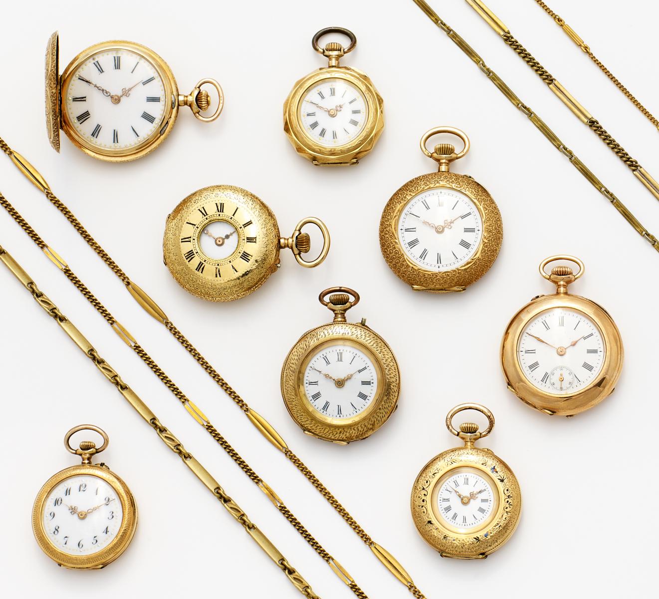 Gehäuse: 7 Uhren: 585/- Gelb-/Roségold, gest., 1 Uhr: Goldfarben, Zffbl. Emaille, Handaufzug. Anbei 6 unedle Uhrenketten. D.ca. 26-31mm. Gewicht: 585/- GG/RG: 147,1g, Goldfarben: 17,4g.