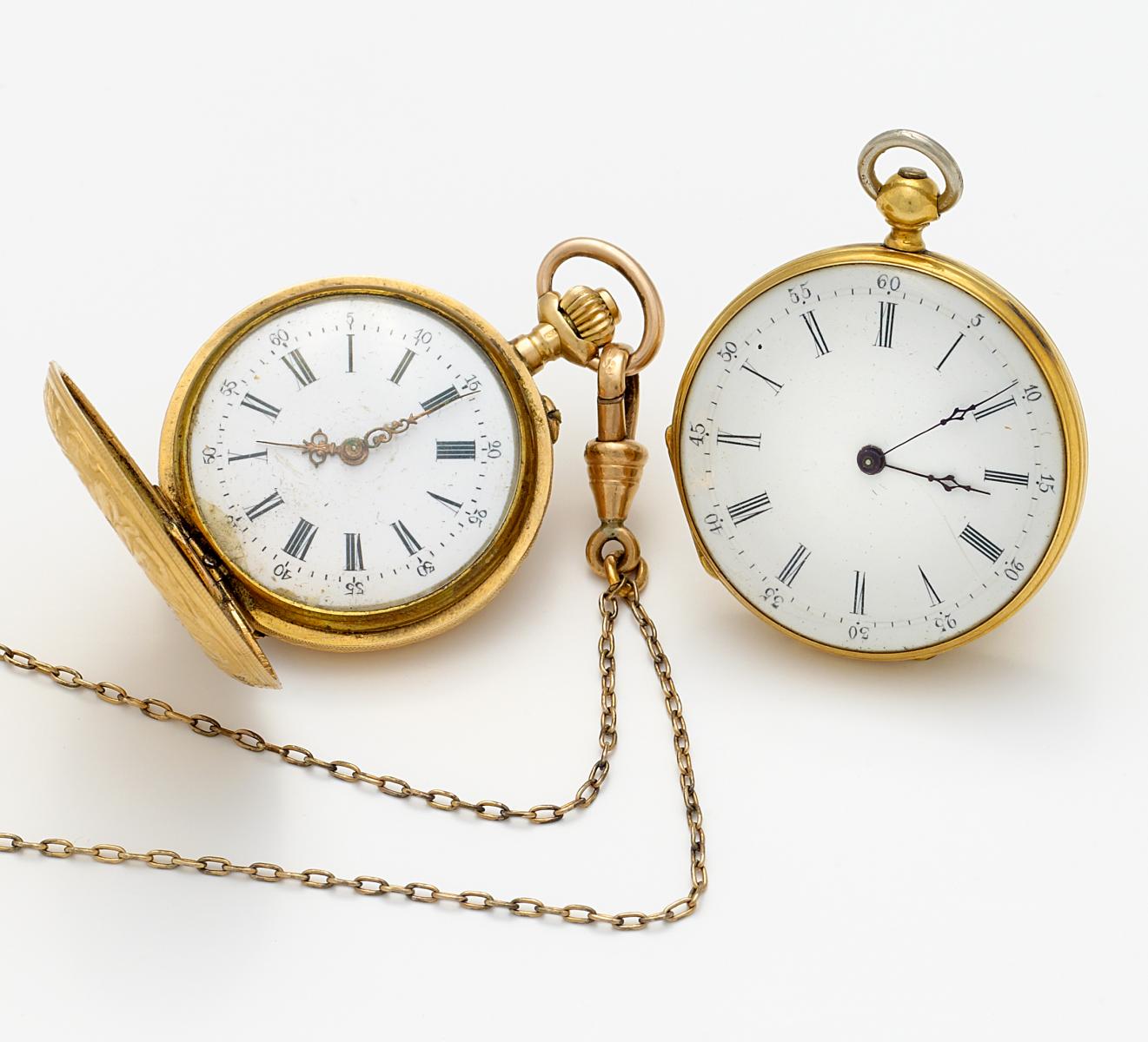 Spindeltaschenuhr u.A.. Gehäuse: 750/- Gelbgold, gestempelt, Zffbl. Emaille, Hand-/Schlüsselaufzug. D.ca. 29mm, 32mm. Gewicht: 45,1g.