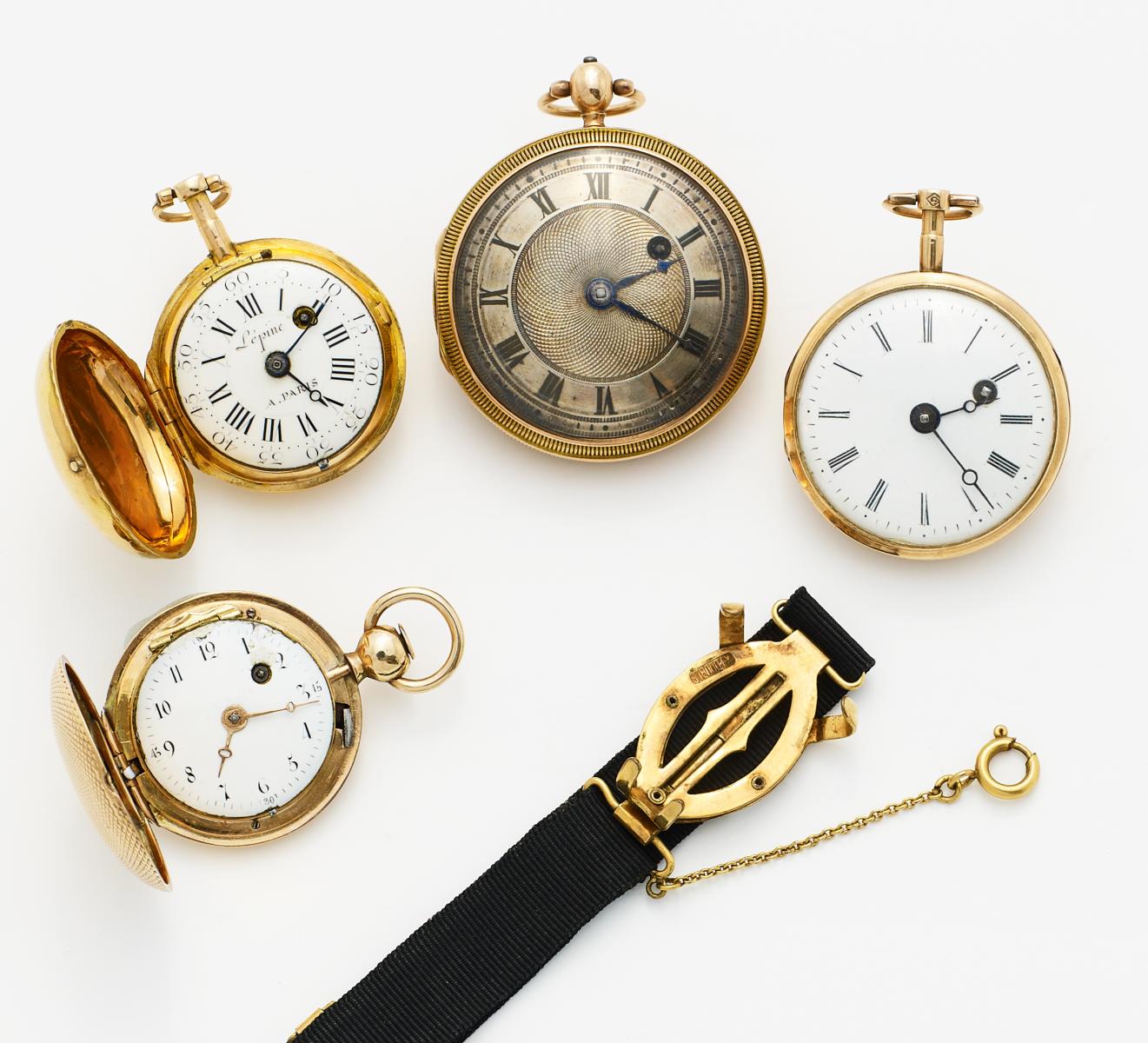 Gehäuse: Goldfarben, Zffbl. Emaille, Schlüsselaufzug. Werke signiert: Berthoud 1349 A PARIS; Franz Oberschneider Grätz; Rillet a Vienne Jacob