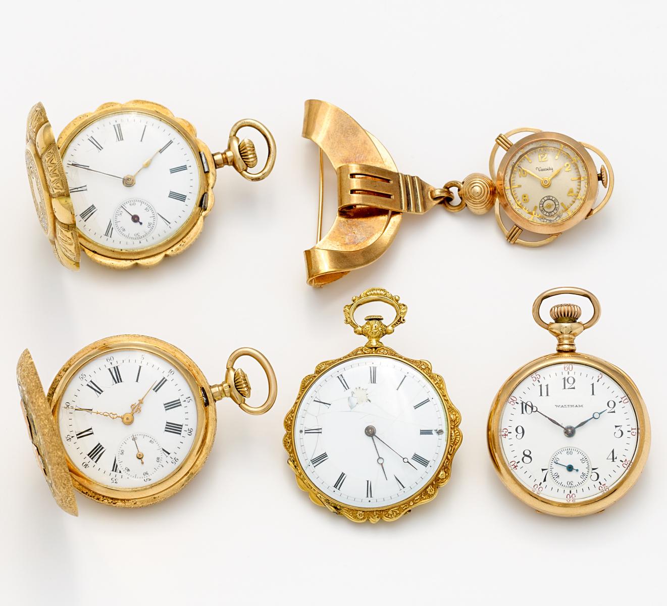 Waltham, Varsily, unsign. Gehäuse: 4 Uhren: Goldfarben, 1 Uhr: 585/- Roségold, gestempelt, Zffbl. Emaille, Handaufzug/Schlüsselaufzug. Broschierung Varsily-Uhr: L. 6,4cm. D.ca. 32mm, 21mm, 35mm, 36mm. Gewicht: Goldfarben: 108,2g, 585/- RG: 31,0g.