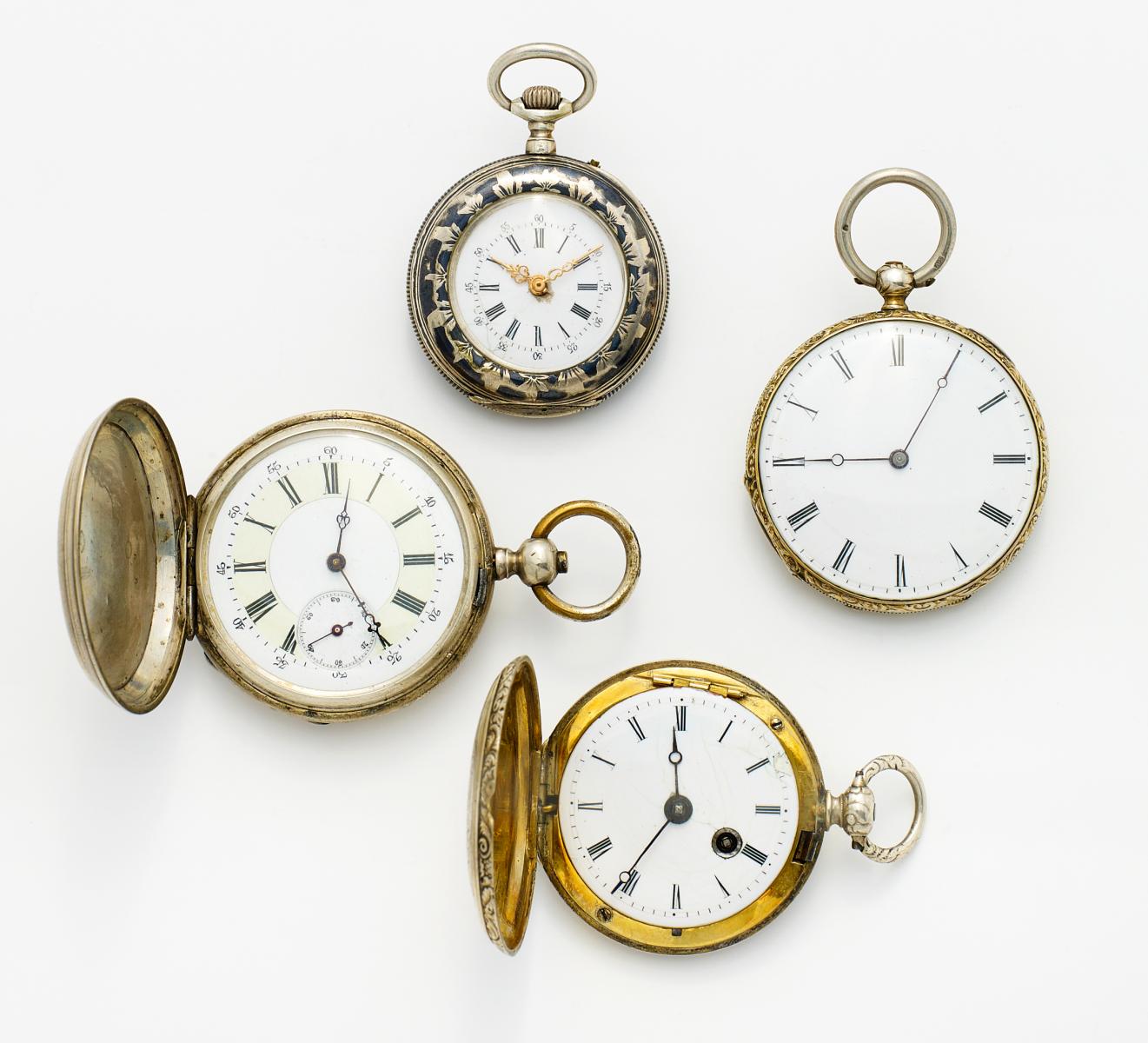 Sechs Spindeltaschenuhren u.A.. Gehäuse: Silbern, Zffbl. Emaille, Hand-/Schlüsselaufzug. Zffbl. signiert Le Roy a Paris; Zffbl. beschrieben "Arbeite & Spare". Teils floral