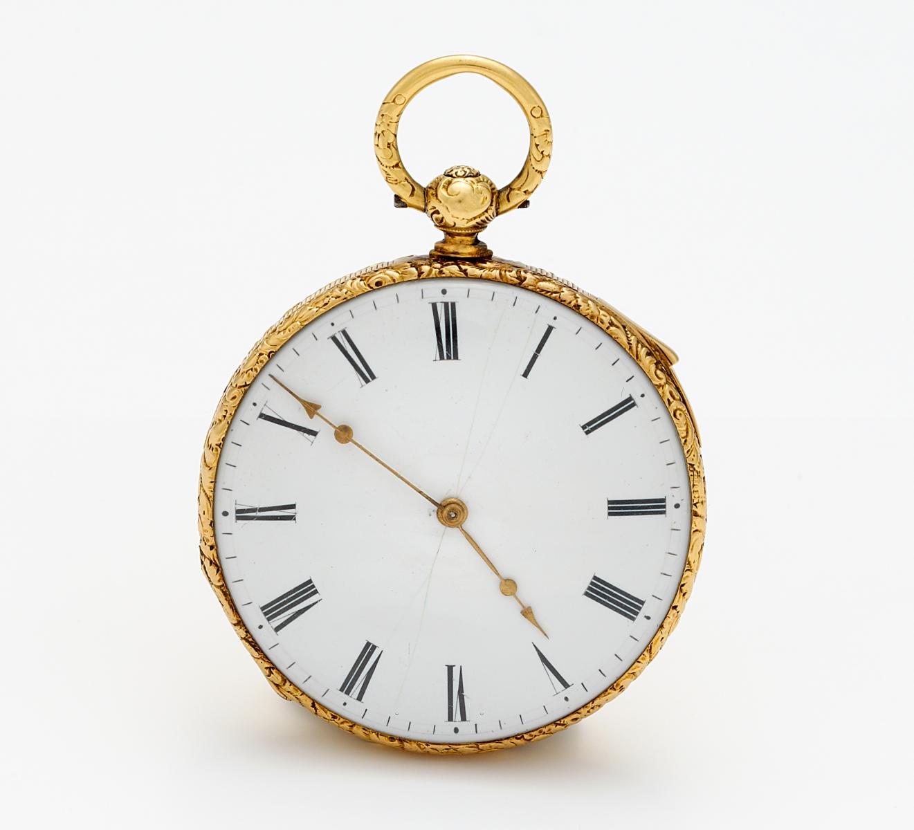 Gehäuse: Gelbgold, Zffbl. Emaille, rö. Ziffern, Schlüsselaufzug. Mit Schlagwerk, feine ziselierte Oberfläche. D.ca. 46mm. Gewicht: 58,4g. Um 1880.~