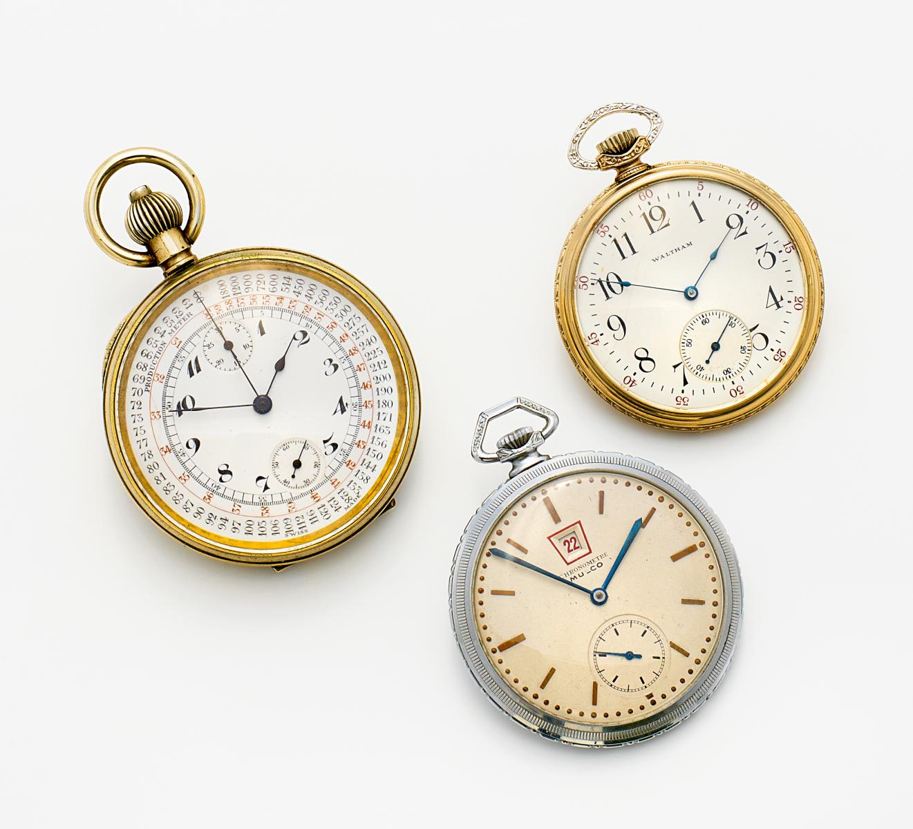 Waltham, Mulco, unsign. Frackuhr u.A.. Gehäuse: Silbern, Zffbl. Emaille, goldene Indizes, Handaufzug. D.ca. 43mm, 47mm, 51mm. Gewicht: 58,2g, 54,9g, 101,8g.