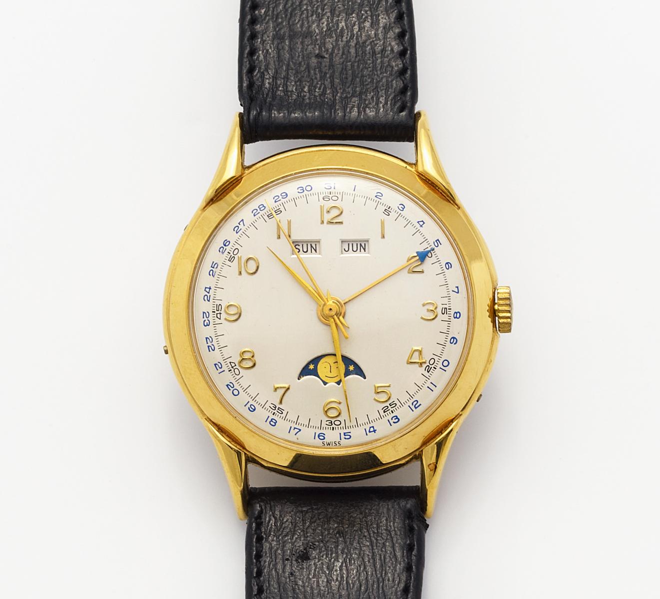 Gehäuse-Nr.: 142. Gehäuse: Edelstahl/ vergoldet, Lederarmband schwarz, vergoldete Dornschließe, Zffbl. creme, Mondphase, Wochentag-/Monatsanzeige, Handaufzug. L. 23,5cm, D.ca. 36mm. Gewicht: 45,2g. Um 1980.~