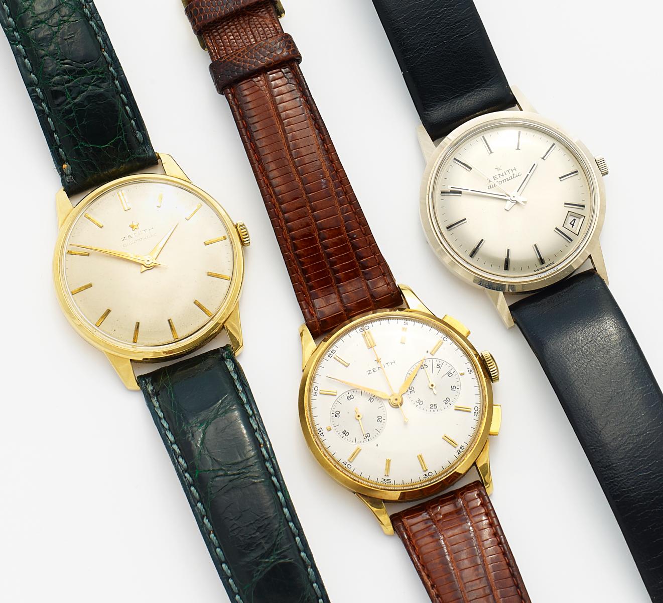 Drei Herrenarmbanduhren. Gehäuse-Nr.: 488325, 396D910, 936633. Gehäuse: Gelbgold, Edelstahl, Lederarmband schwarz, braun, grün; vergoldete Dornschließen, silberne Zenith-Dornschließe, Zffbl. weiß, silbern, creme, Handaufzug, Automatik. L. 22,-23,5cm, D.ca. 35mm. Gewicht: 43,2g, 41,2g, 36,0g.