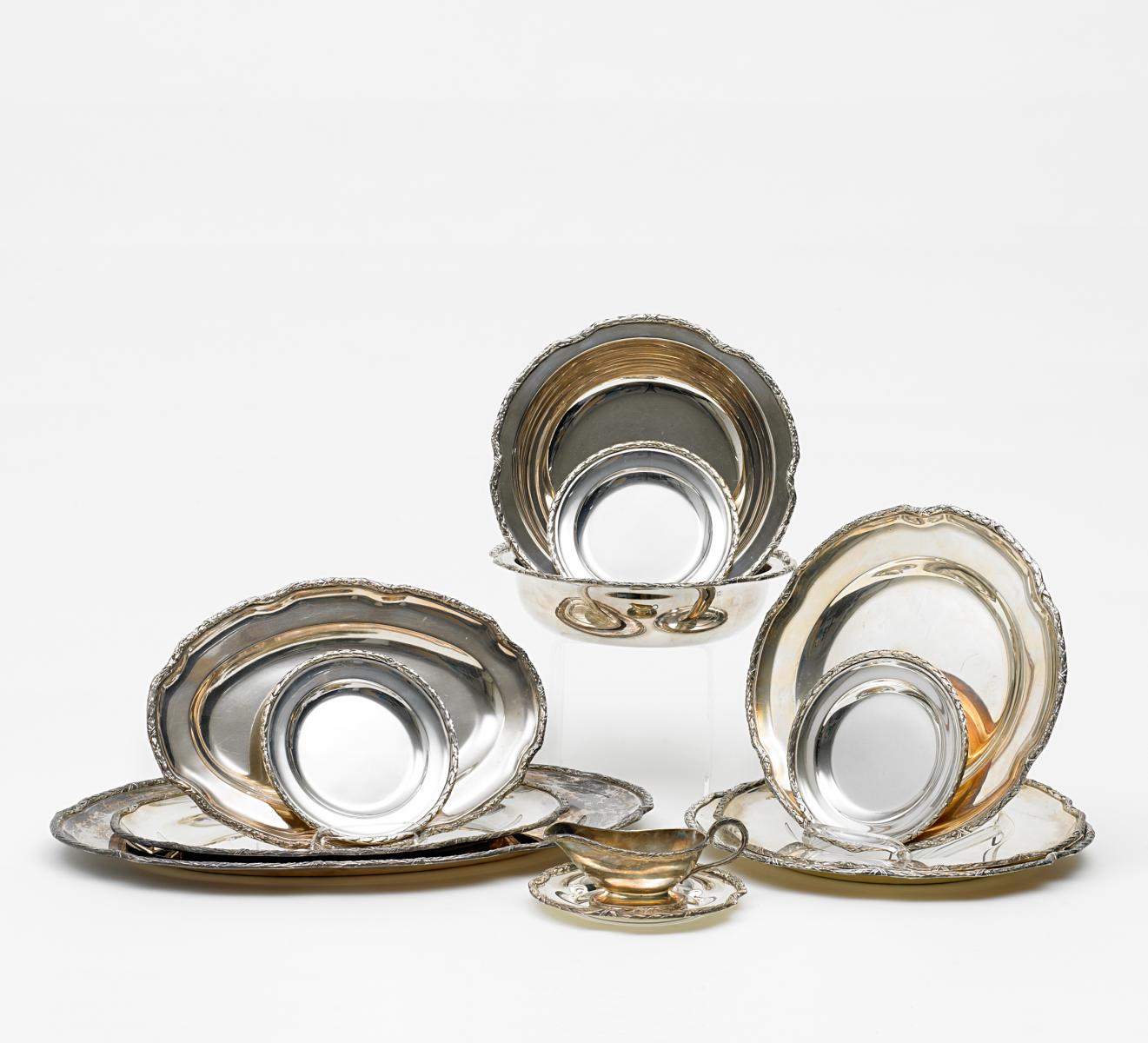 Konvolut drei ovale Platten, sieben runde Platten, zwei Schüsseln, eine kleine Sauciere.