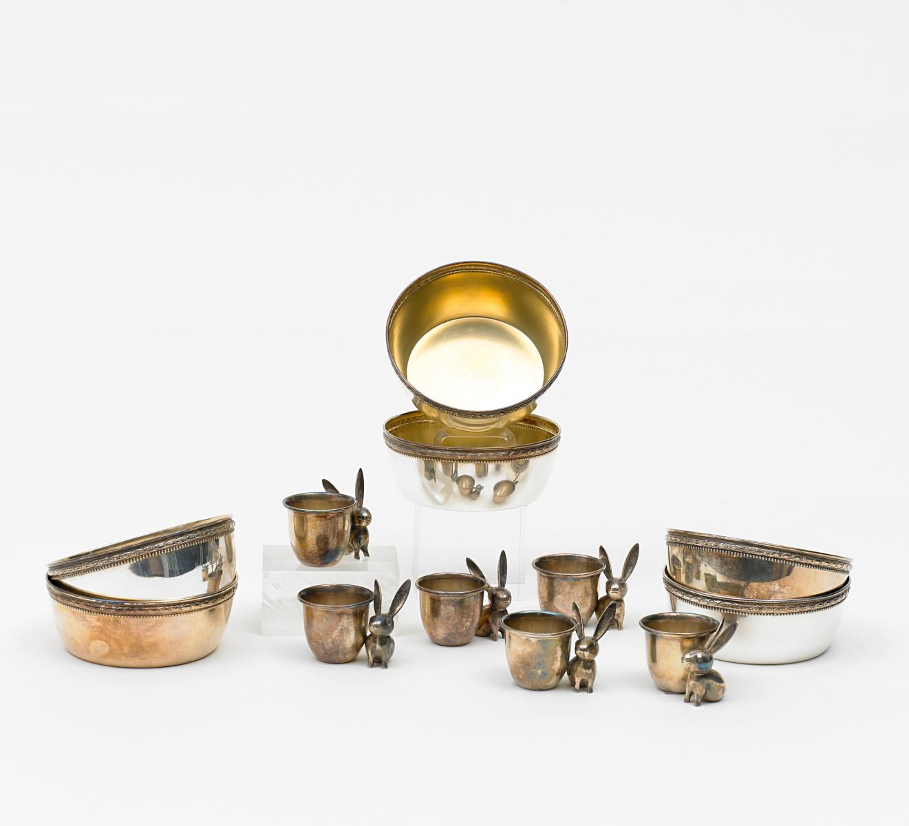 Silber, tlw. innen vergoldet. H. Schale 4,5cm, H. Eierbecher 5cm. Ca. 1008g. Zustand A. -A/B.