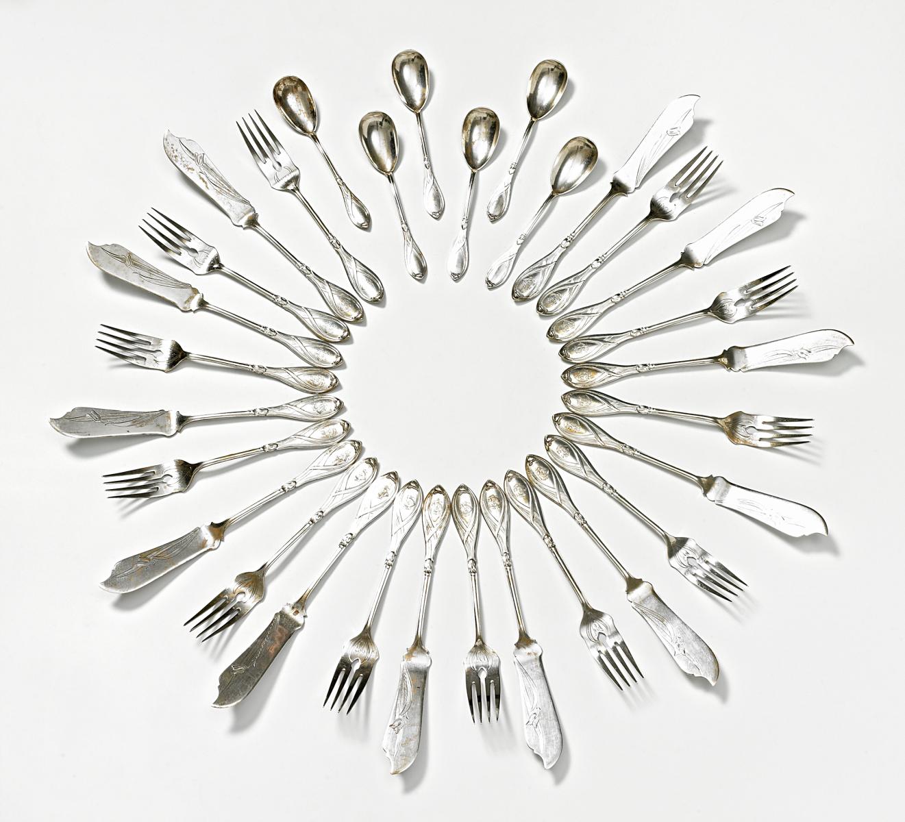 Silber. 12 Personen. Insg. 24 Teile, best. aus 12 Fischgabeln, 12 Fischmessern. Ca. 1306g. Zustand B.