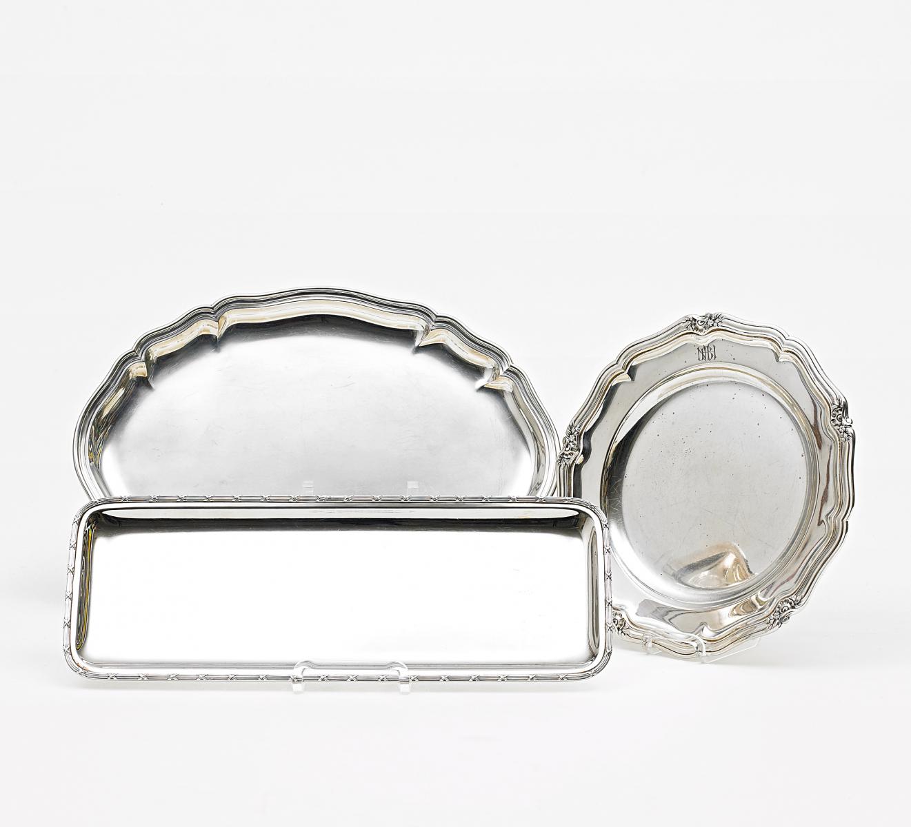 Silber, einmal mit Glaseinsatz. L.40/41cm, + 27,5cm. Ca. 2179g. Zustand A.