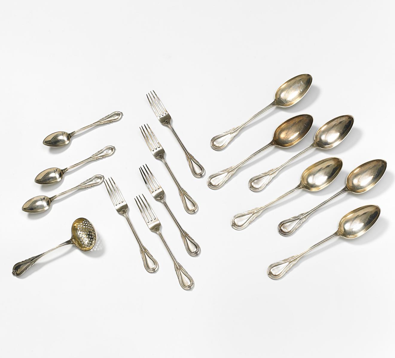 Silber. Insg. 15 Teile best. aus 5 Gabeln, 6 Speiselöffeln, 3 Kaffeelöffeln, 1 Zuckerlöffel. Ca. 909g. Zustand A/B.