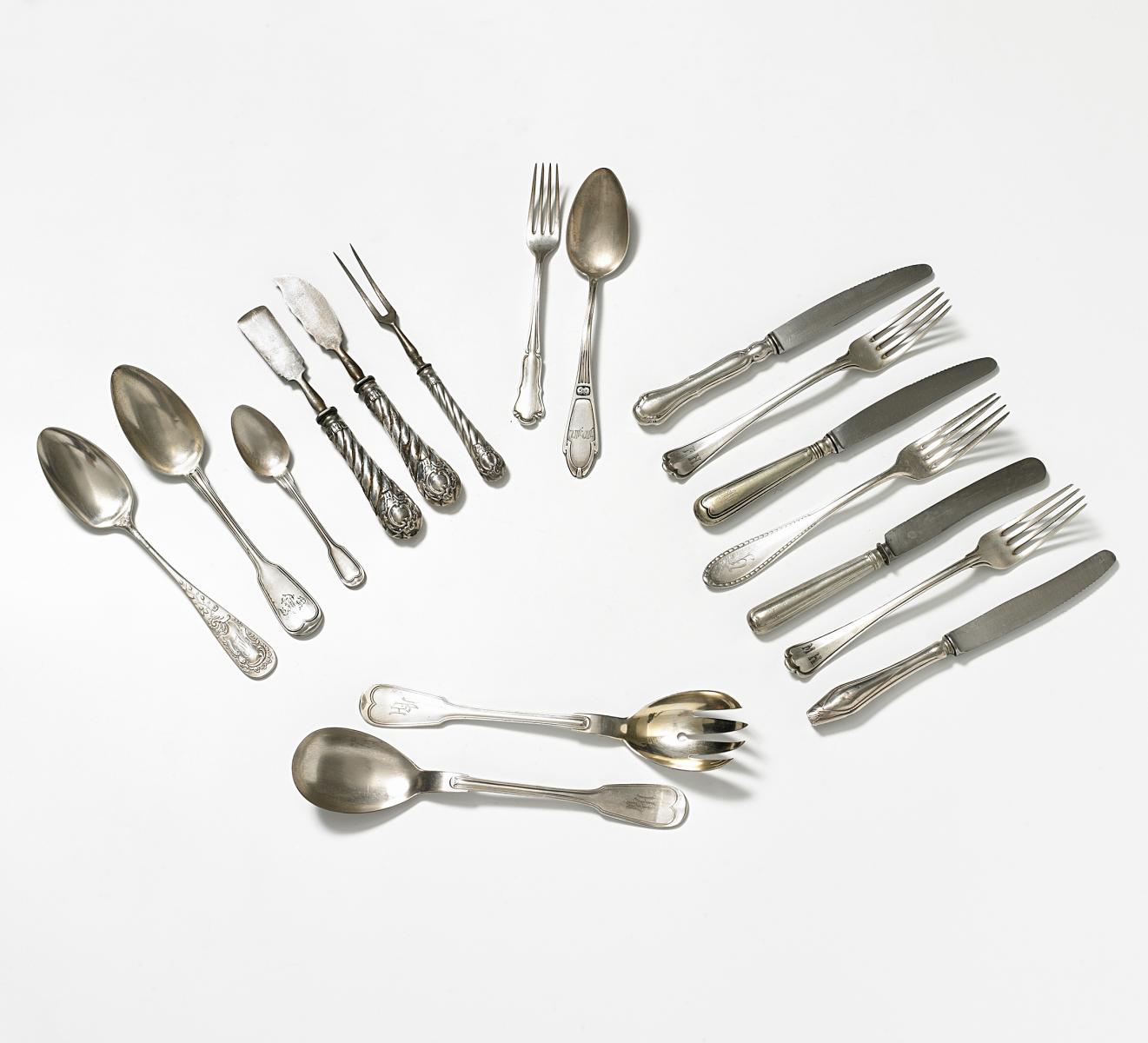 Silber. Insg. 22 Teile, best. aus 8 Gabeln versch., 6 Speiselöffeln versch., Salatbesteck, 6