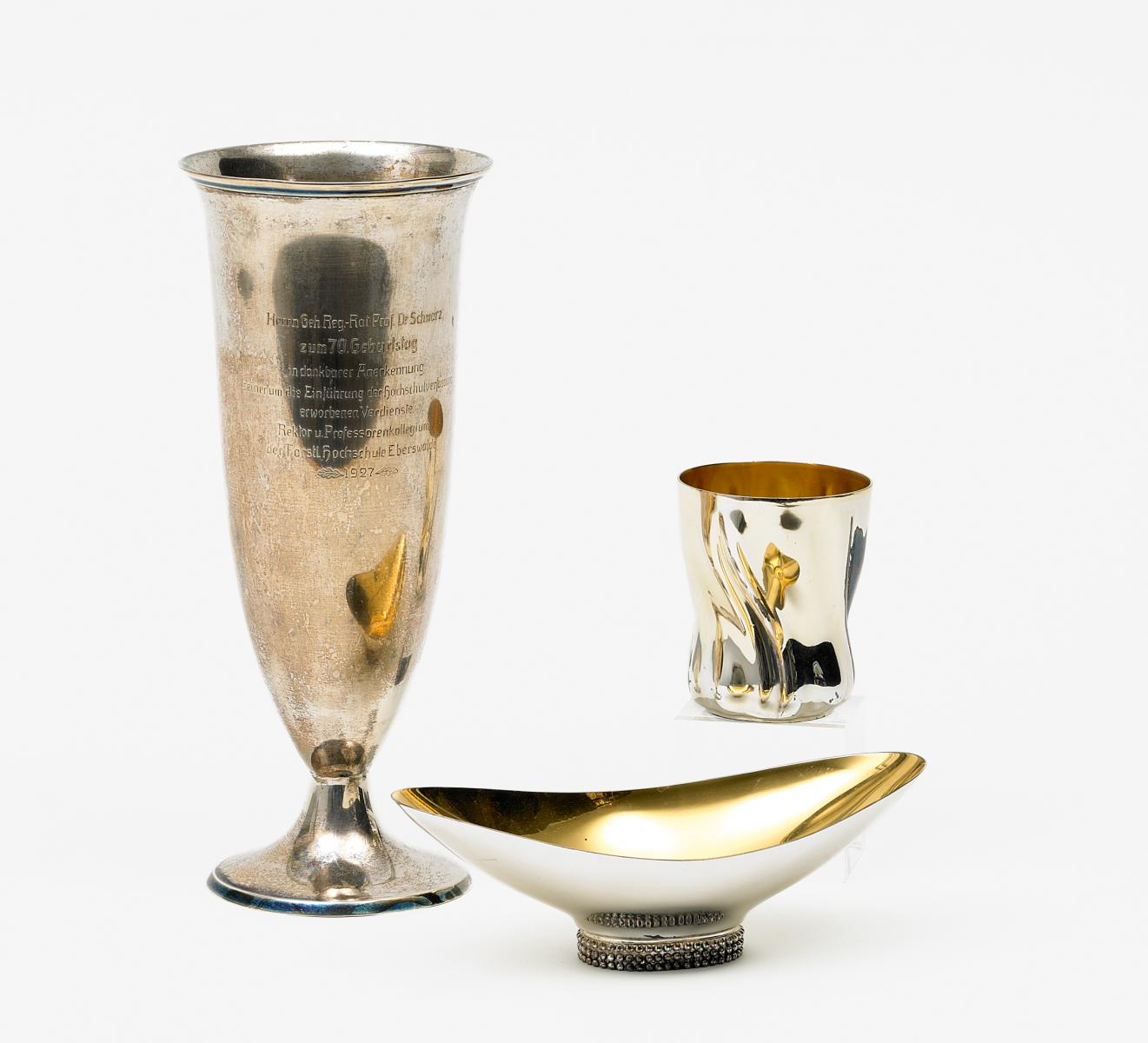 Silber, tlw. innen vergoldet. H.27,5/9cm, L. Schale 20cm. Ca. 759g. Zustand A-B. Marke 800, Firmenmarke/ Marke 925 Sterling, Firmenmarke/Marke 830S, Firmenmarke.