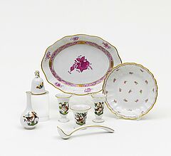 Porzellan, farbig und tlw. gold staffiert. {Beil.:} Zwei Schälchen. Herend bzw. Royal Limoges. H.5/6,5/6,5/8,5/5,5cm, L.14cm. Zustand A.