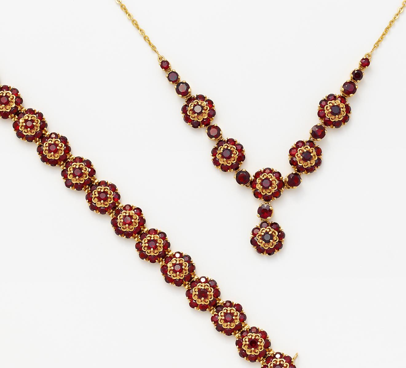 585/- Rot-/Gelbgold, gestempelt. 48,2g. 171 rund facettierte Granate, Collier: L. 44,5cm, Armband: L x B=18,8 x 1,2cm.~