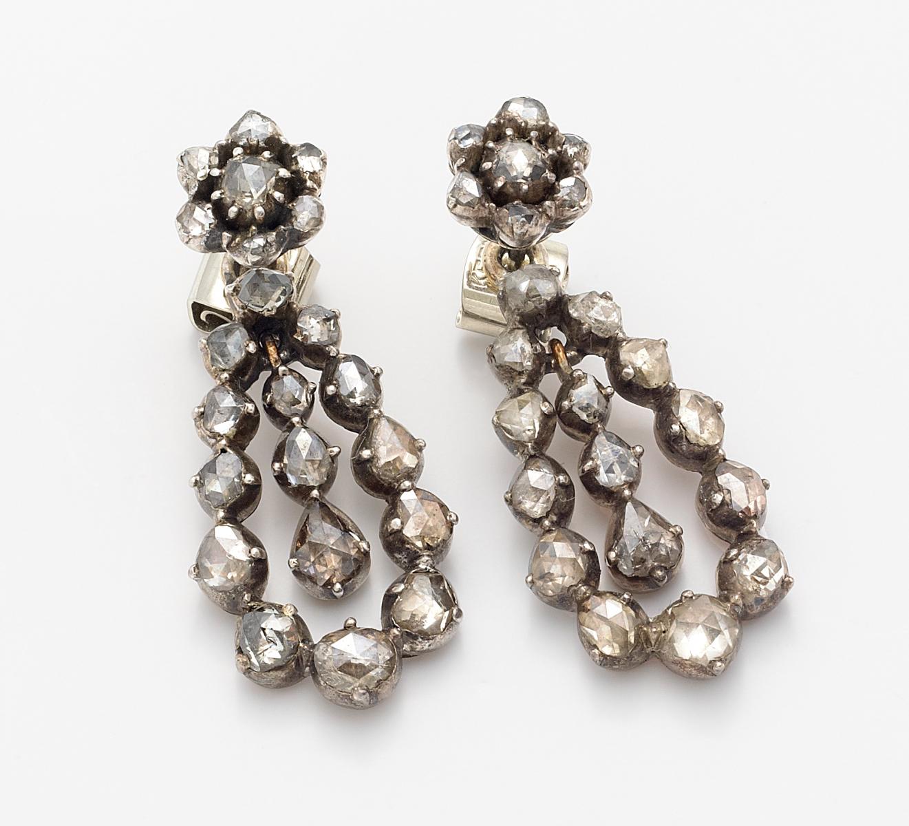 Silbern, Ohrmuttern: 750/- Weißgold. 8,8g. 44 folierte Diamantrosen, D. 0,9mm, L. 2,9cm.~ Ohrstecker separat zu tragen.