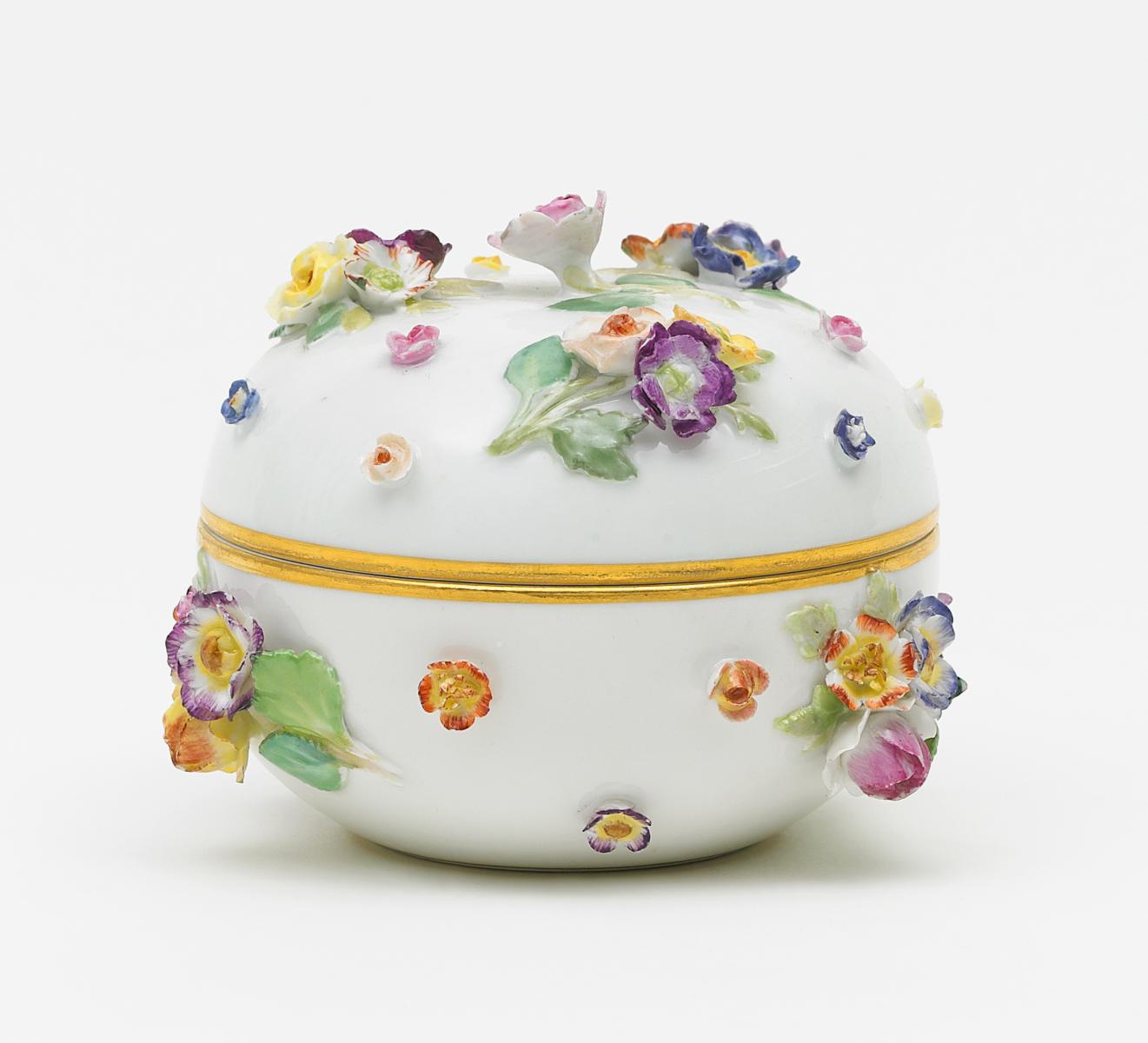 Porzellan, farbig und gold staffiert. H.7,5cm, + 8cm. Zustand B.