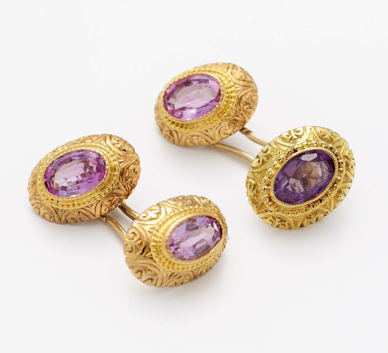 585/- Gelbgold, gestempelt. 5,8g. 4 oval facettierte Amethyste D.ca. 7,4 x 4,8mm, Stegtiefe: 1,3cm, D.ca. 1,3cm.~