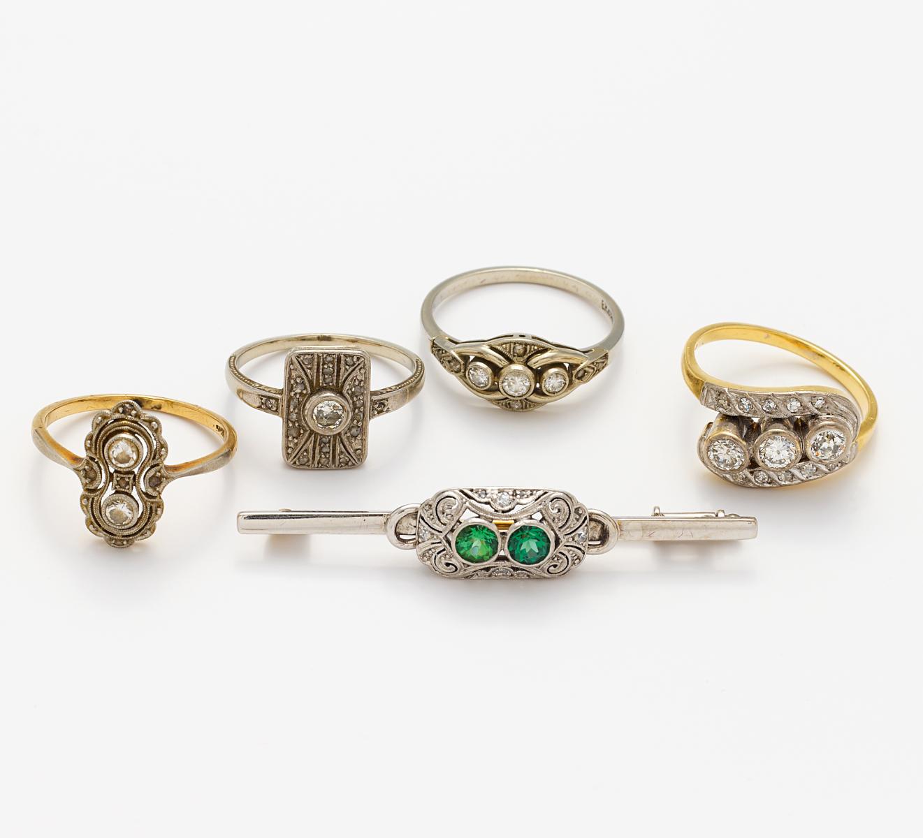 Konvolut: Art Deco. Stabnadel und vier Ringe mit Diamantbesatz.