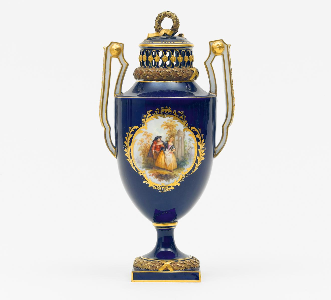 Aufsatzvase mit Watteauszene und Blumenbouquet.