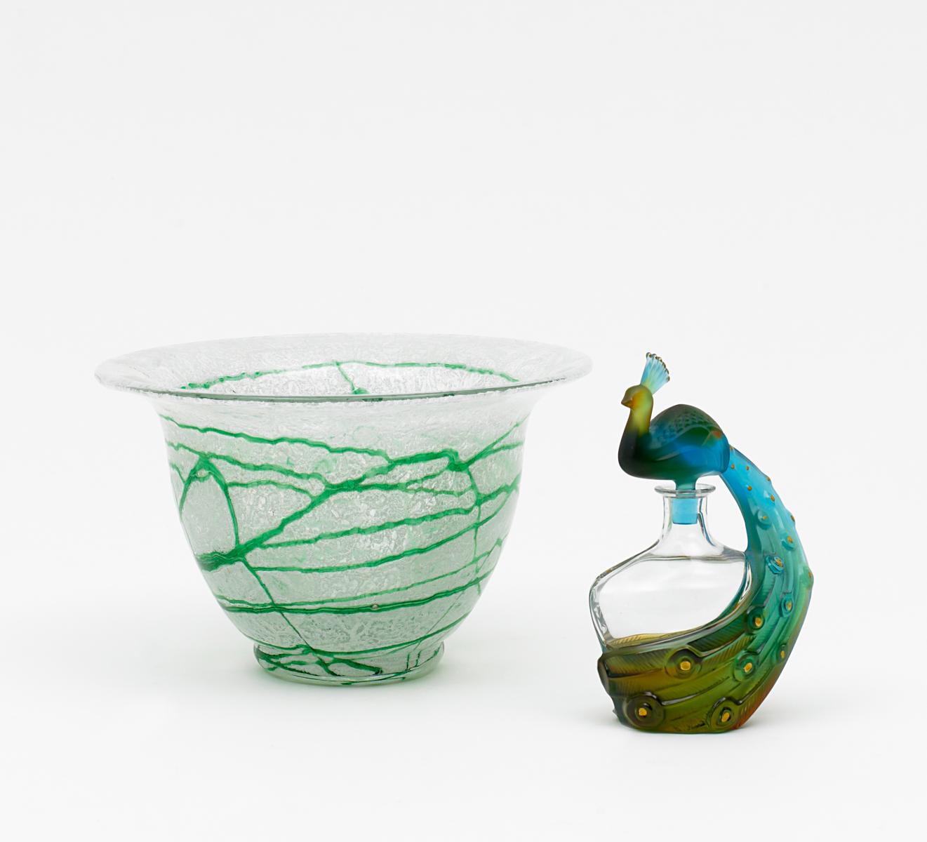 Flakon mit Pfau und Glasvase.