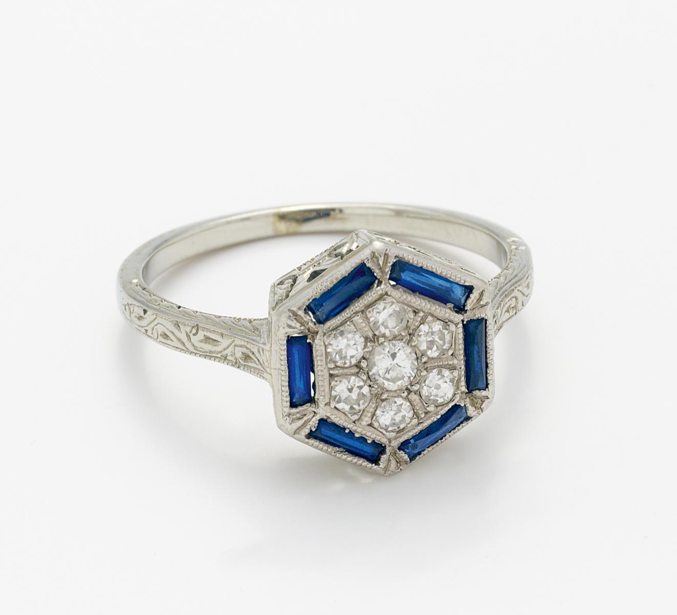 Silbern. 3,2g. 6 synthetische Saphir-Baguettes, 7 Diamanten im 8/8- und Altschliff, EU-RM: 52.