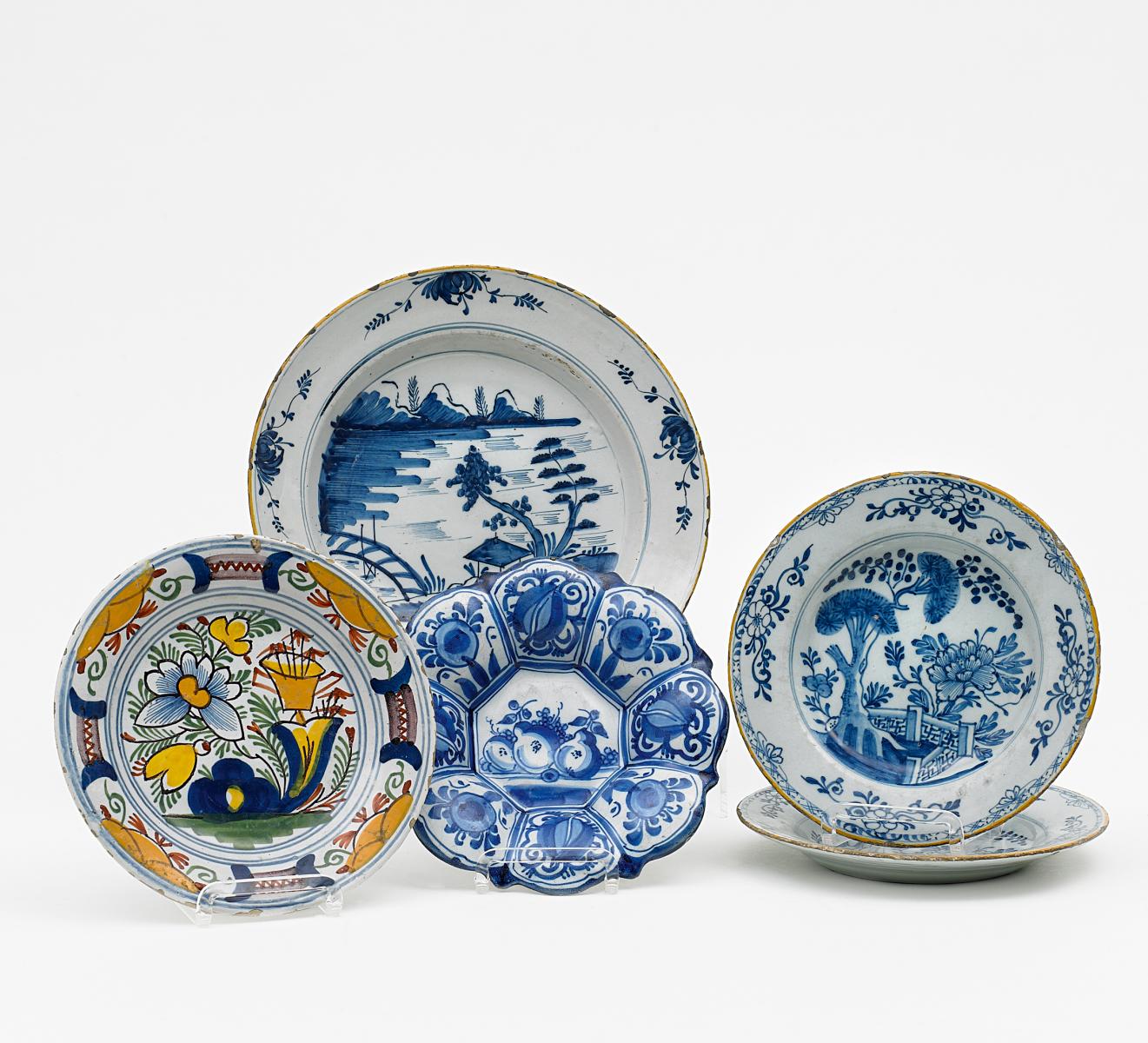 Sandfarbener Scherben, weiß glasiert, blauer und farbiger Dekor. + 22/23/30cm. Zustand B-B/C.