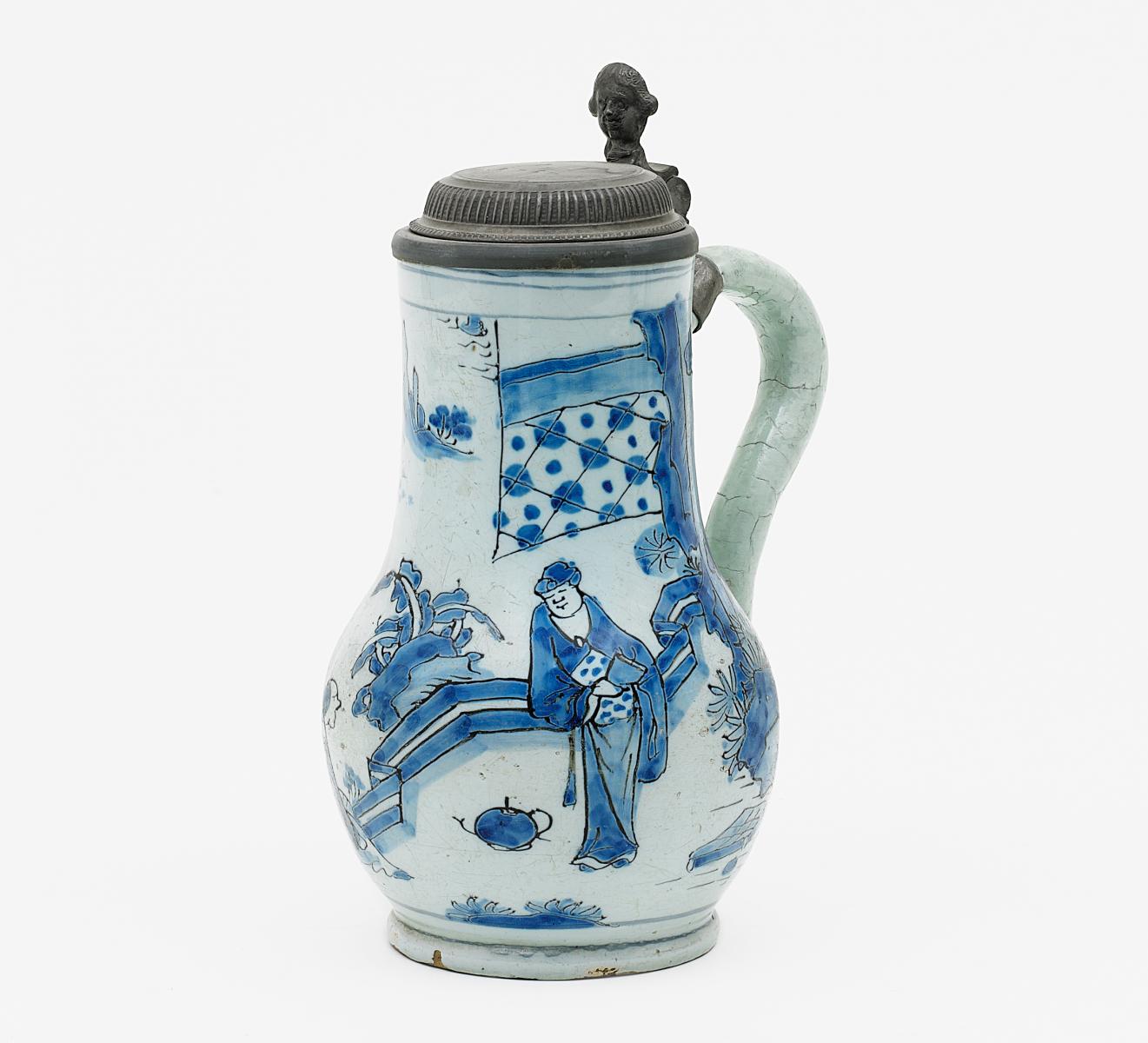 Sandfarbener Scherben, weiß glasiert, blauer Dekor. Zinnmontierung. H.27cm. Zustand C.