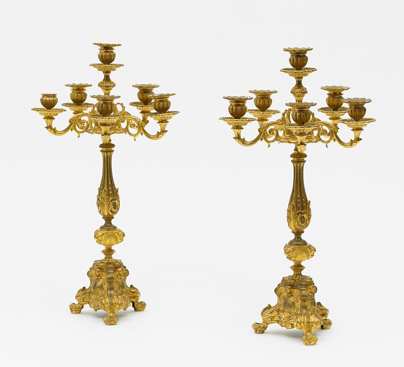 Bronze vergoldet. H. je 49cm. Zustand A/B. Sechsflammig.