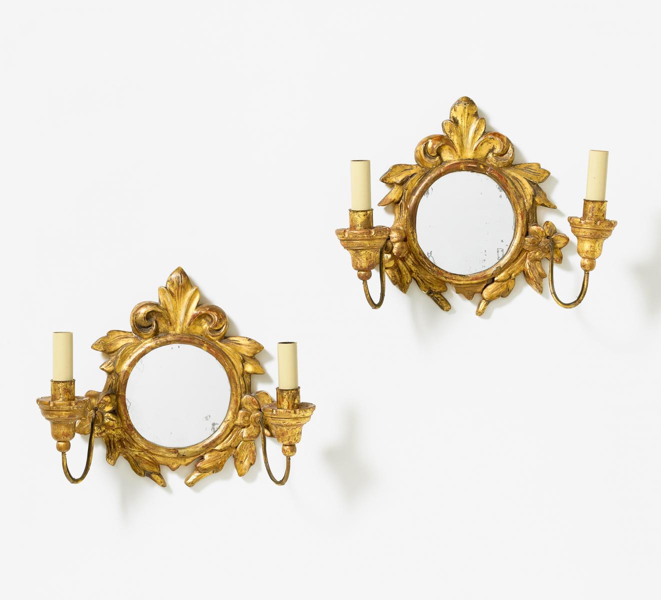 Holz vergoldet. H. je 28cm. Zustand C. Zweiflammig. Elektrifiziert.