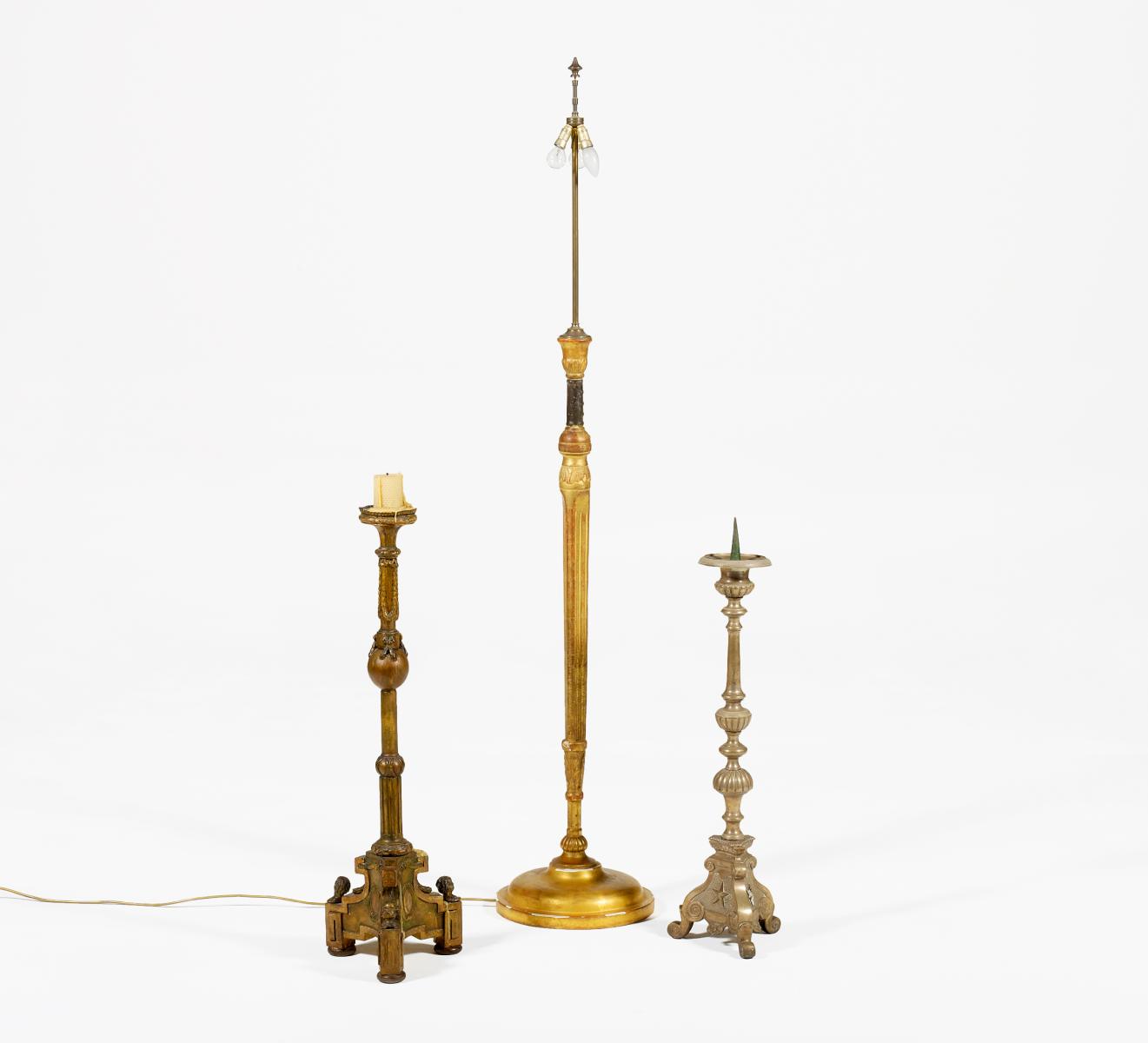 Holz geschnitzt, tlw. gefasst. Metall. H.97/99,5/196,5cm. Zustand B-C. Einmal elektrifiziert.