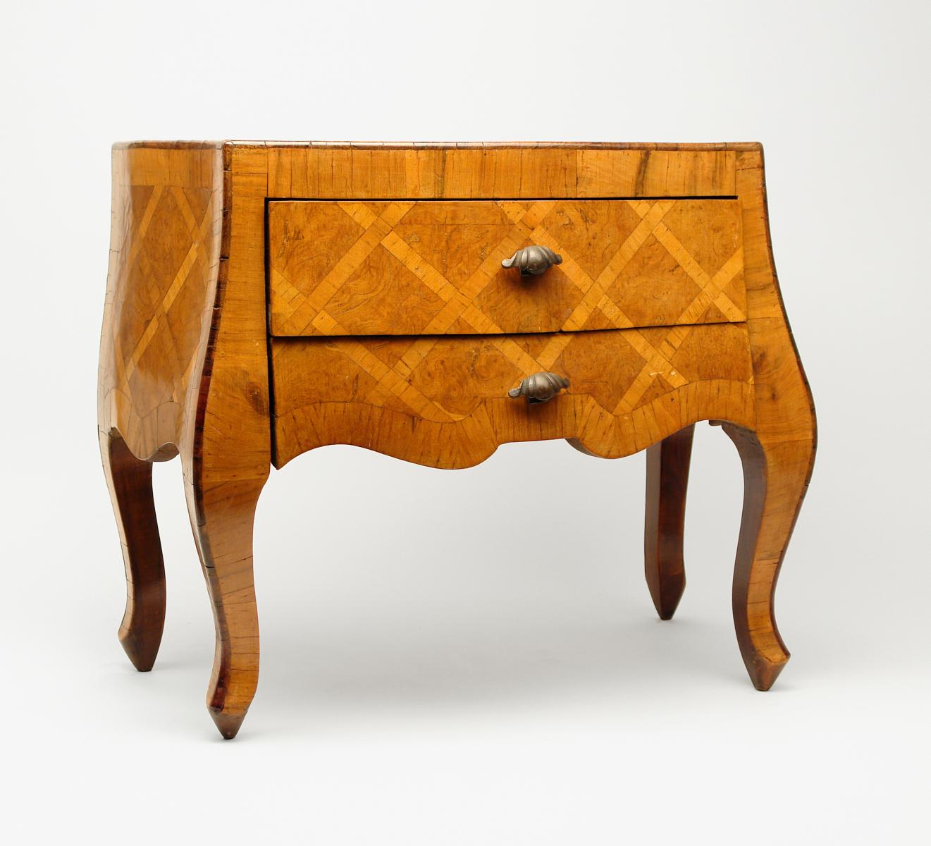 Nussbaum und Nussbaummaserholz poliert und eingelegt. 41x50x29cm. Zustand C.